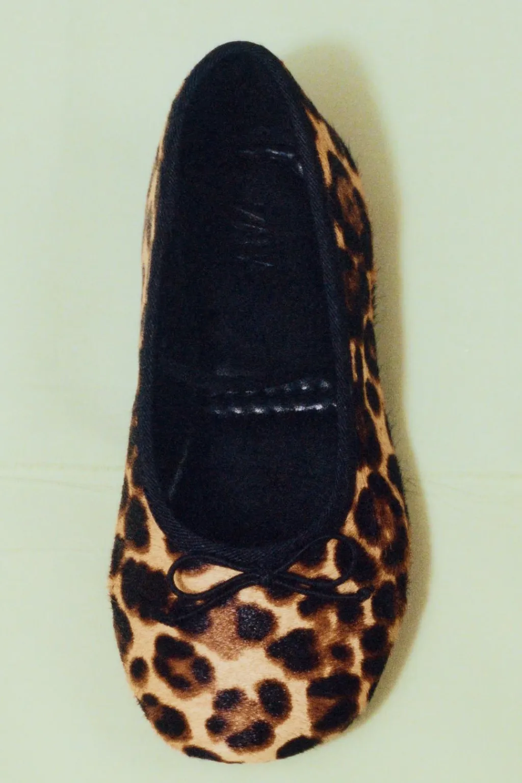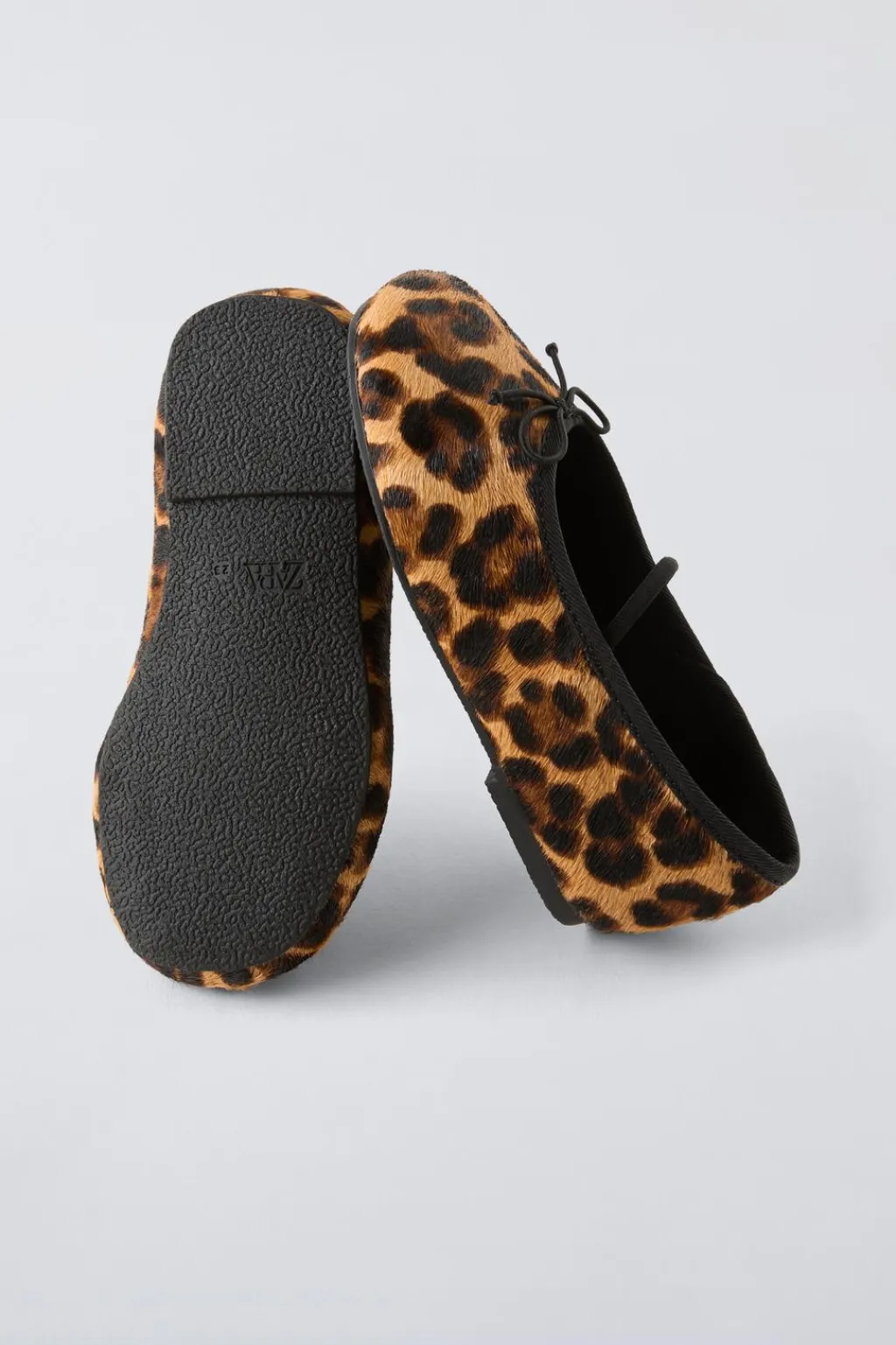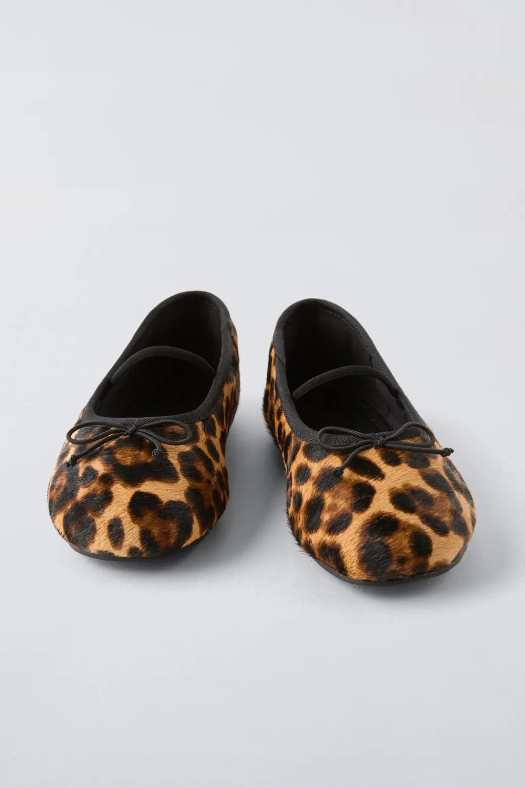 Zapato tipo bailarina 100% piel con pelo de vaca y detalle lazo. Tira elástica en el empeine para una mejor sujeción. Plantilla flexible. Suela de goma.