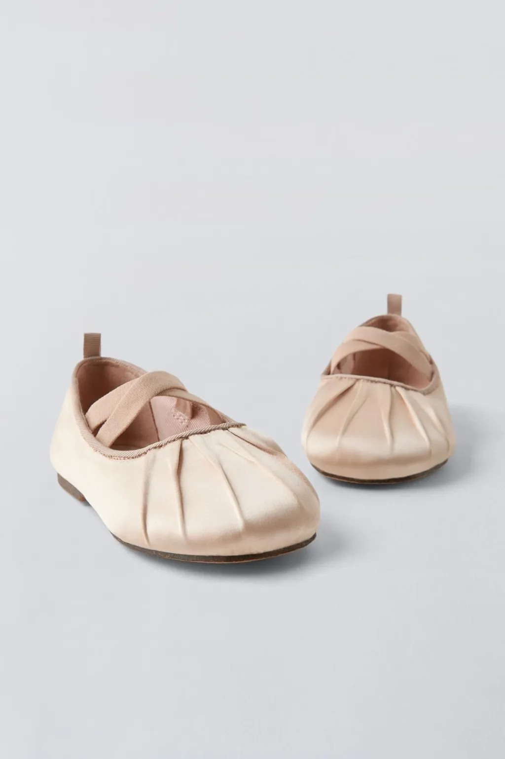 Zapato tipo bailarina efecto raso con detalle fruncido en la puntera. Doble tira elástica en forma de cruz para mejorar la sujeción. Plantilla flexible. Suela de goma.