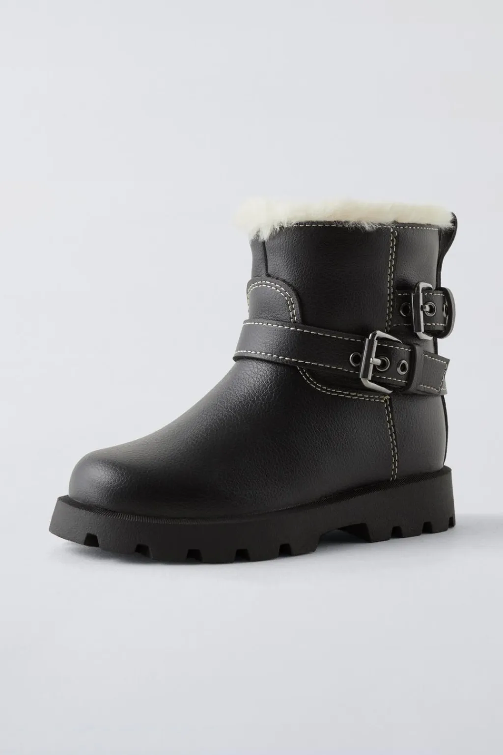 Bota forrada detalle doble hebilla en el lateral. Cierre mediante cremallera lateral. Tirador trasero para facilitar el calce. Plantilla flexible. Suela de goma dentada estilo track.