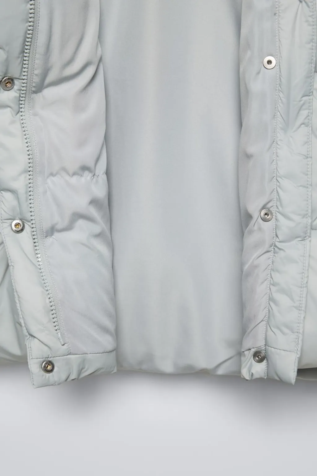 Abrigo con capucha, cuello subido y manga larga. Cierre cremallera frontal y botones de tipo presión ocultos por tapeta. Bolsillos delanteros con detalle vivo.
