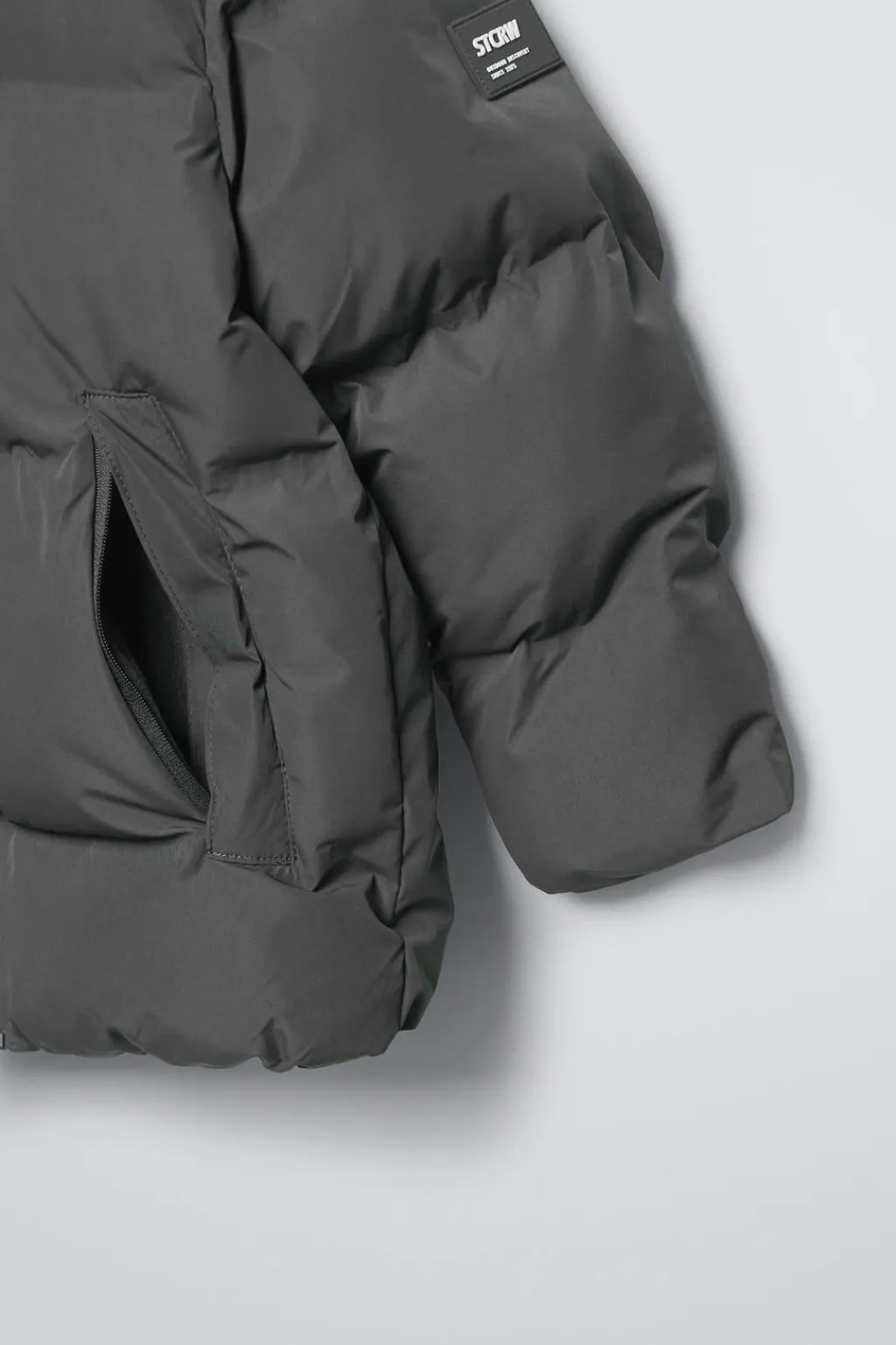 Abrigo con un tejido especial repelente al agua. Con capucha y manga larga acabada en puño oculto. Cierre con cremallera termosellada frontal. Bolsillos en delantero con detalle vivo y cierre con cremallera oculta. Aplique etiqueta goma en manga.