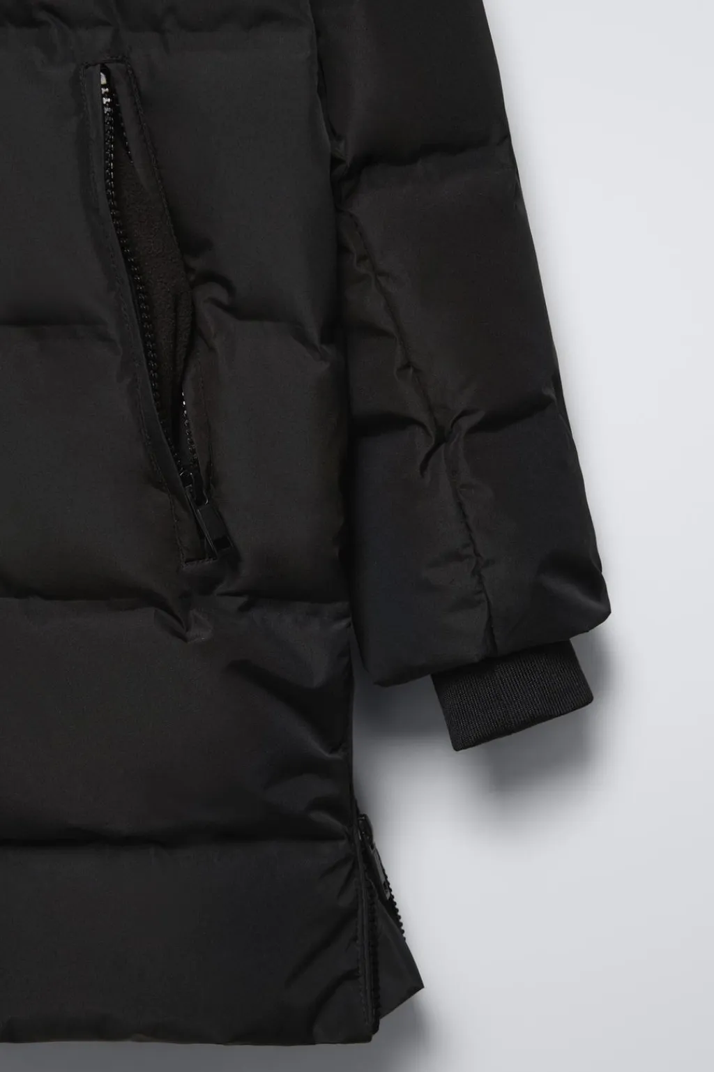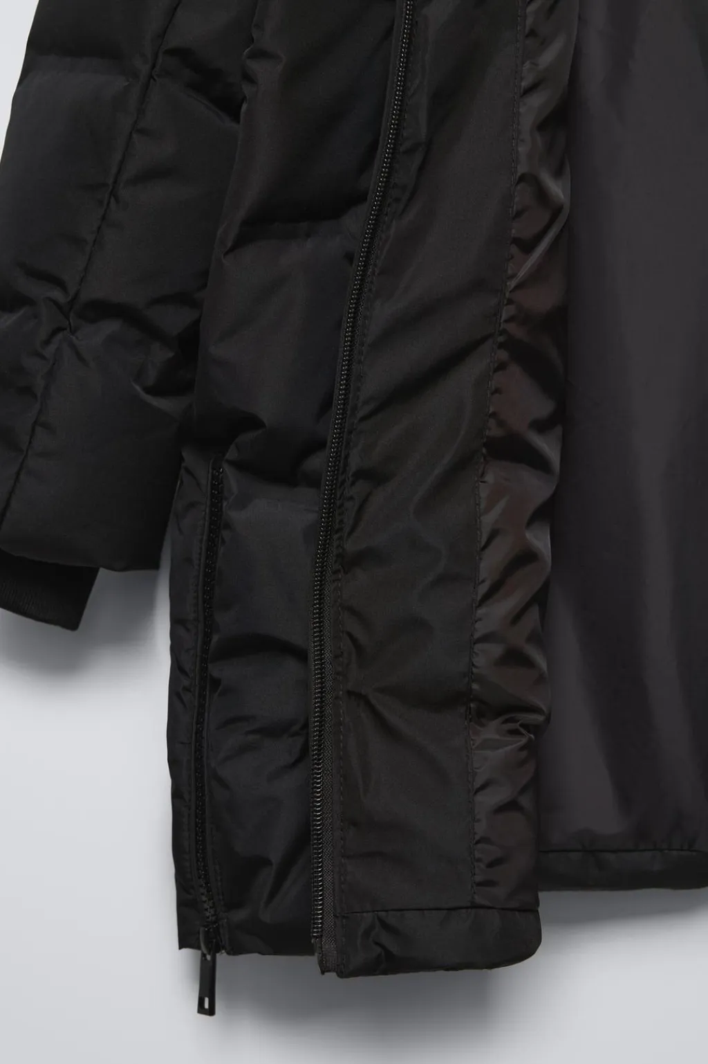 Plumífero largo con 50% pluma y 50% plumón. Con capucha, cuello subido y manga larga acabada en puño oculto. Cierre cremallera frontal de doble abertura. Bolsillos delanteros con cierre cremallera. Detalle cremallera en laterales.