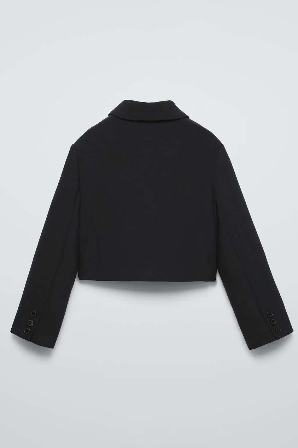 Blazer tipo crop con cuello solapas y manga larga acabada en botones. Cierre botón frontal. Bolsillos delanteros con detalle vivo satinado.