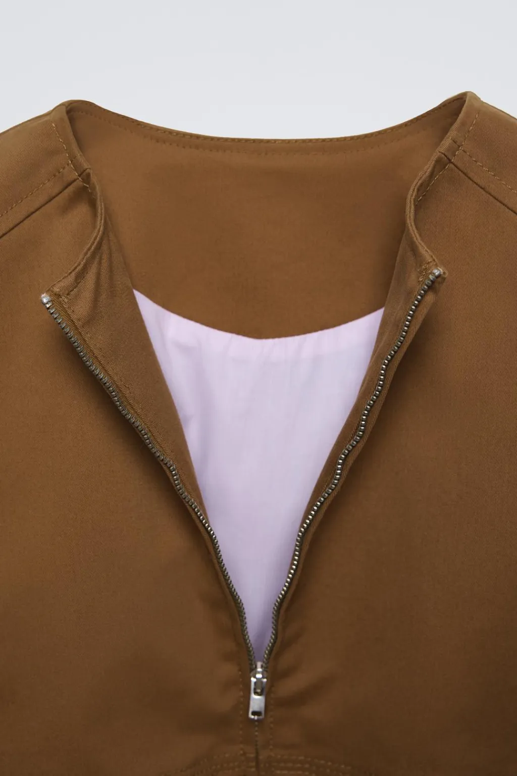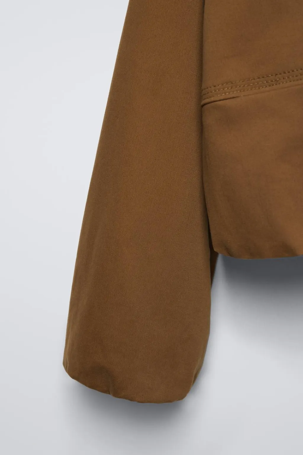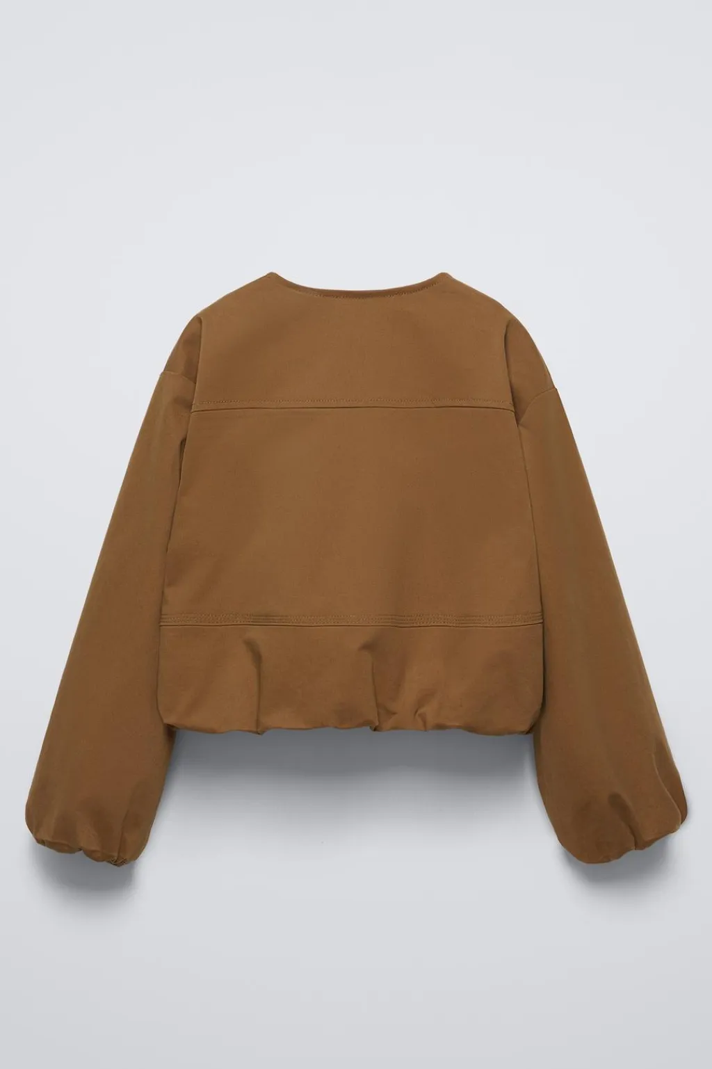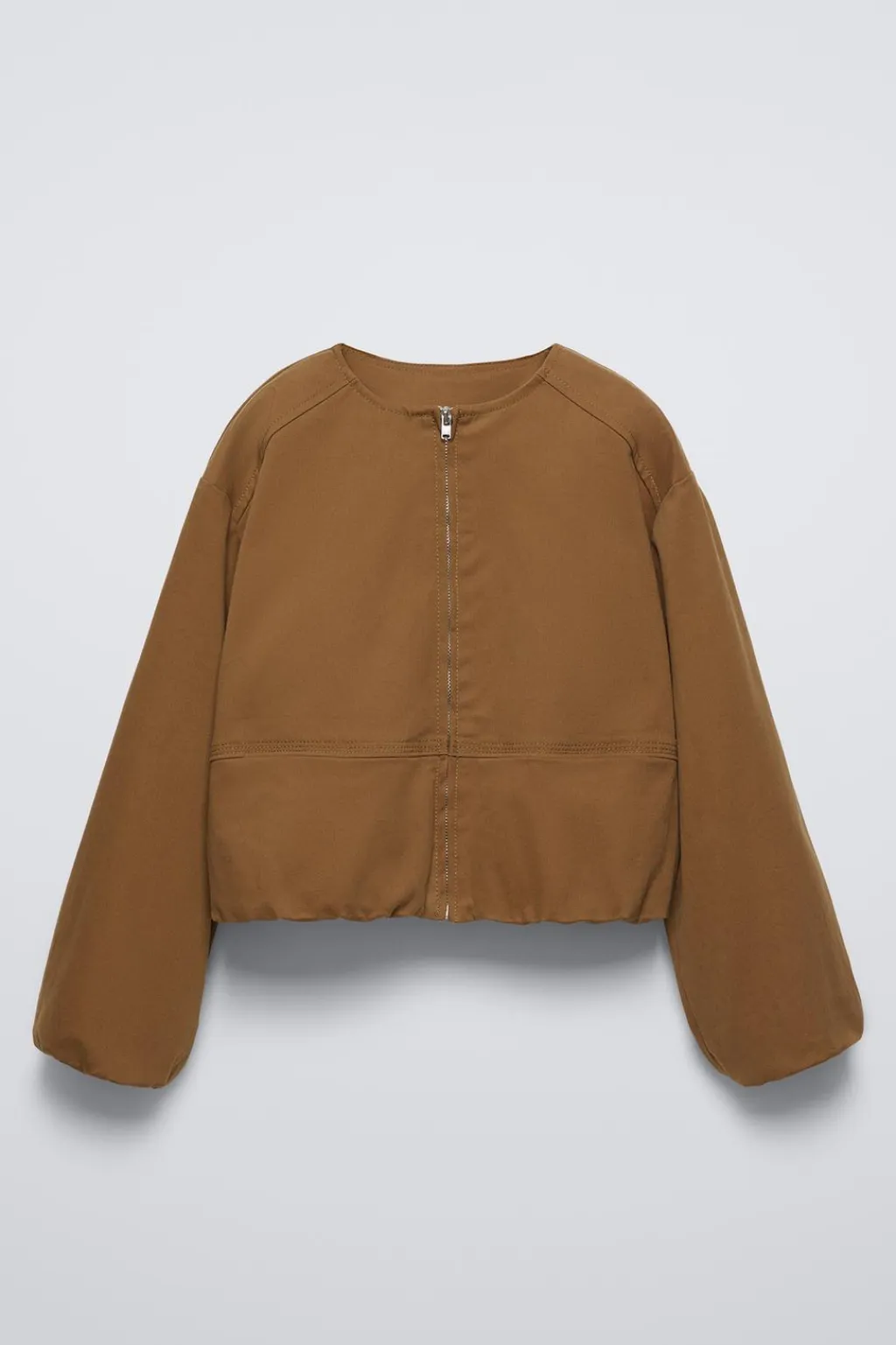 Cazadora con cuello redondo y manga larga abullonada acabada en goma. Cierre cremallera frontal. Bolsillos delanteros ocultos en costura. Bajo acabado en goma efecto globo. Forro interior con color a contraste.
