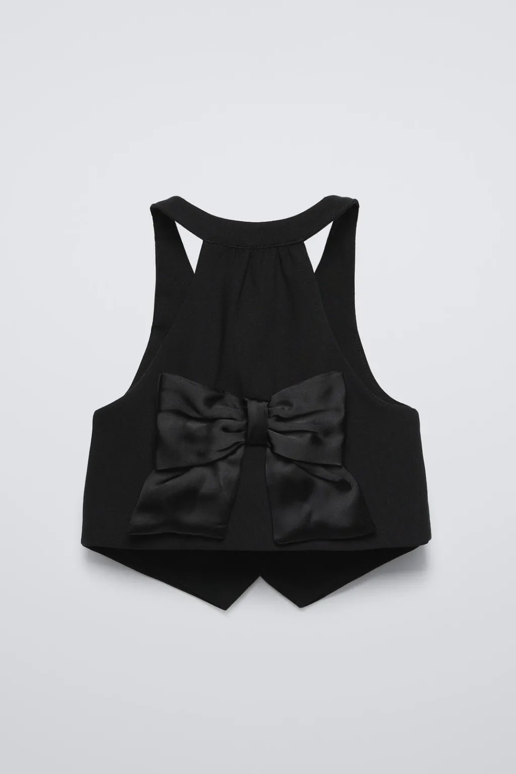 Chaleco con cuello pico y manga sisa. Cierre botonadura frontal. Aplique lazo satinado en espalda.