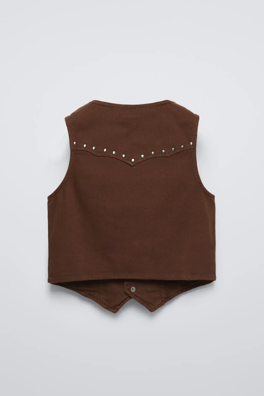 Chaleco con cuello pico y manga sisa. Cierre botones de tipo presión frontal. Detalle falso bolsillo en delantero. Aplique tachas en pechera y espalda.