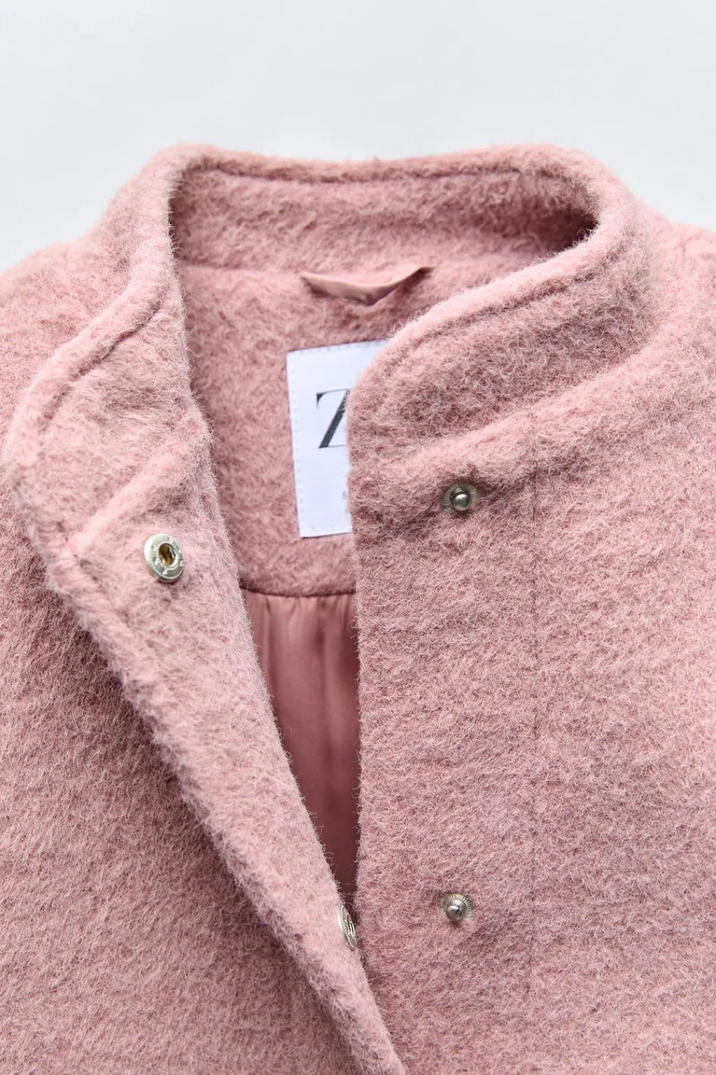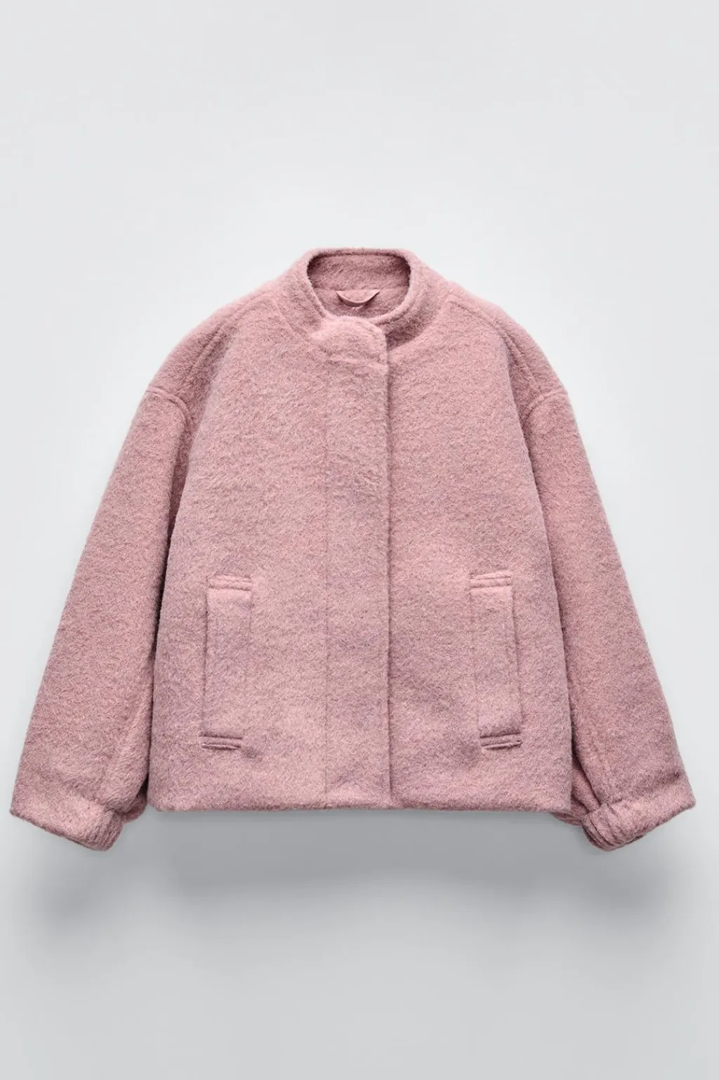 Abrigo tipo bomber con cuello redondo y manga larga acabada en goma. Cierre botonadura de tipo presión frontal. Bolsillos delanteros con detalle vivo.