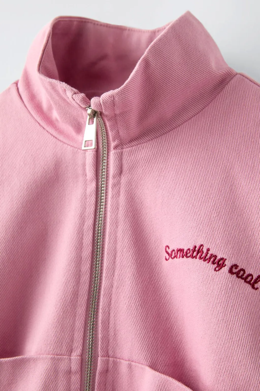 Cazadora con cuello subido y manga larga. Cierre con cremallera frontal. Bolsillos tipo plastrón en delantero. Motivo bordado en la pechera. Acabados con goma.