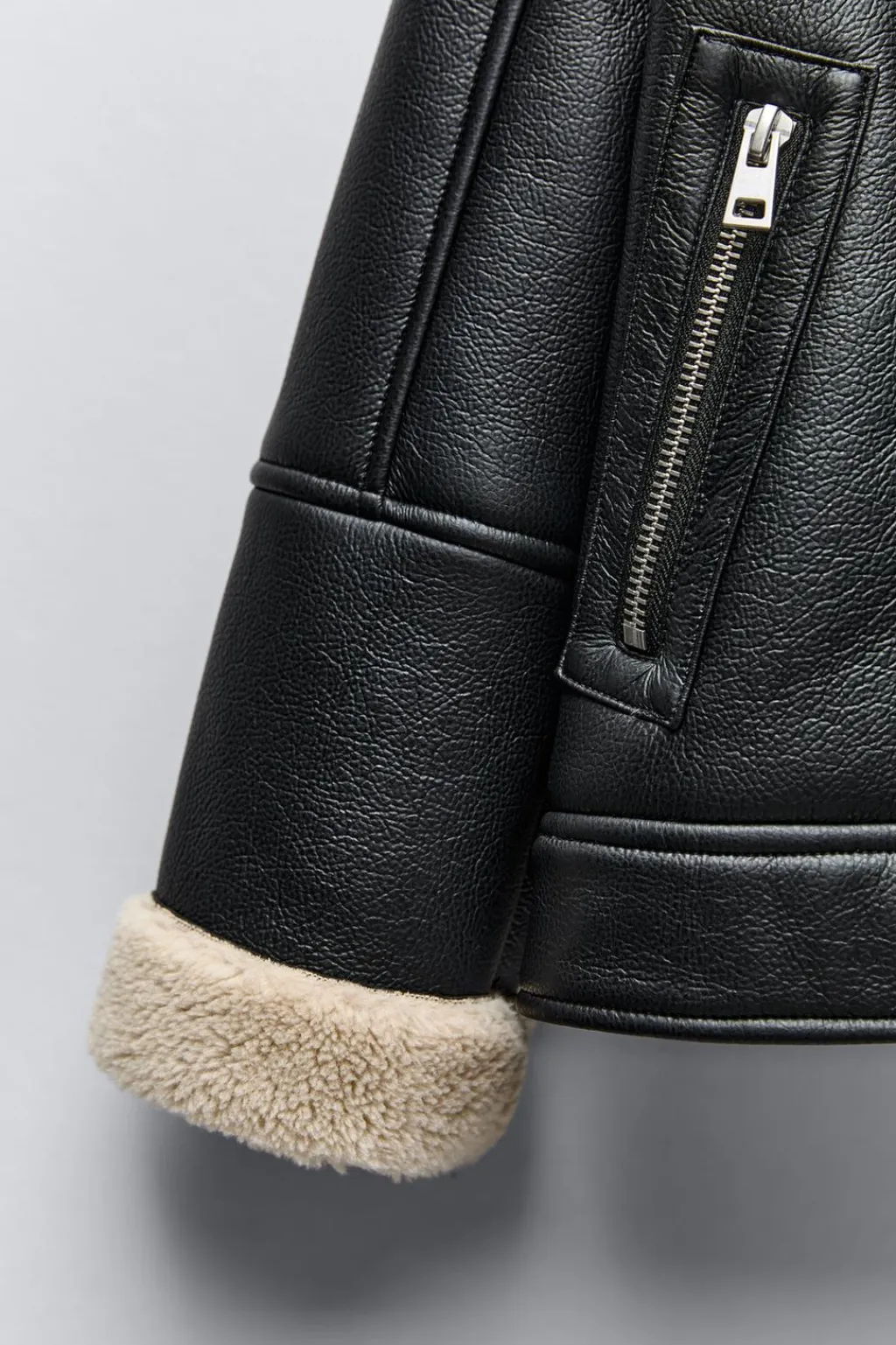 Cazadora con cuello solapa y manga larga. Cierre laterale con cremallera. Bolsillos con cremallera en delantero. Detalle tejido efecto pelo en interior.