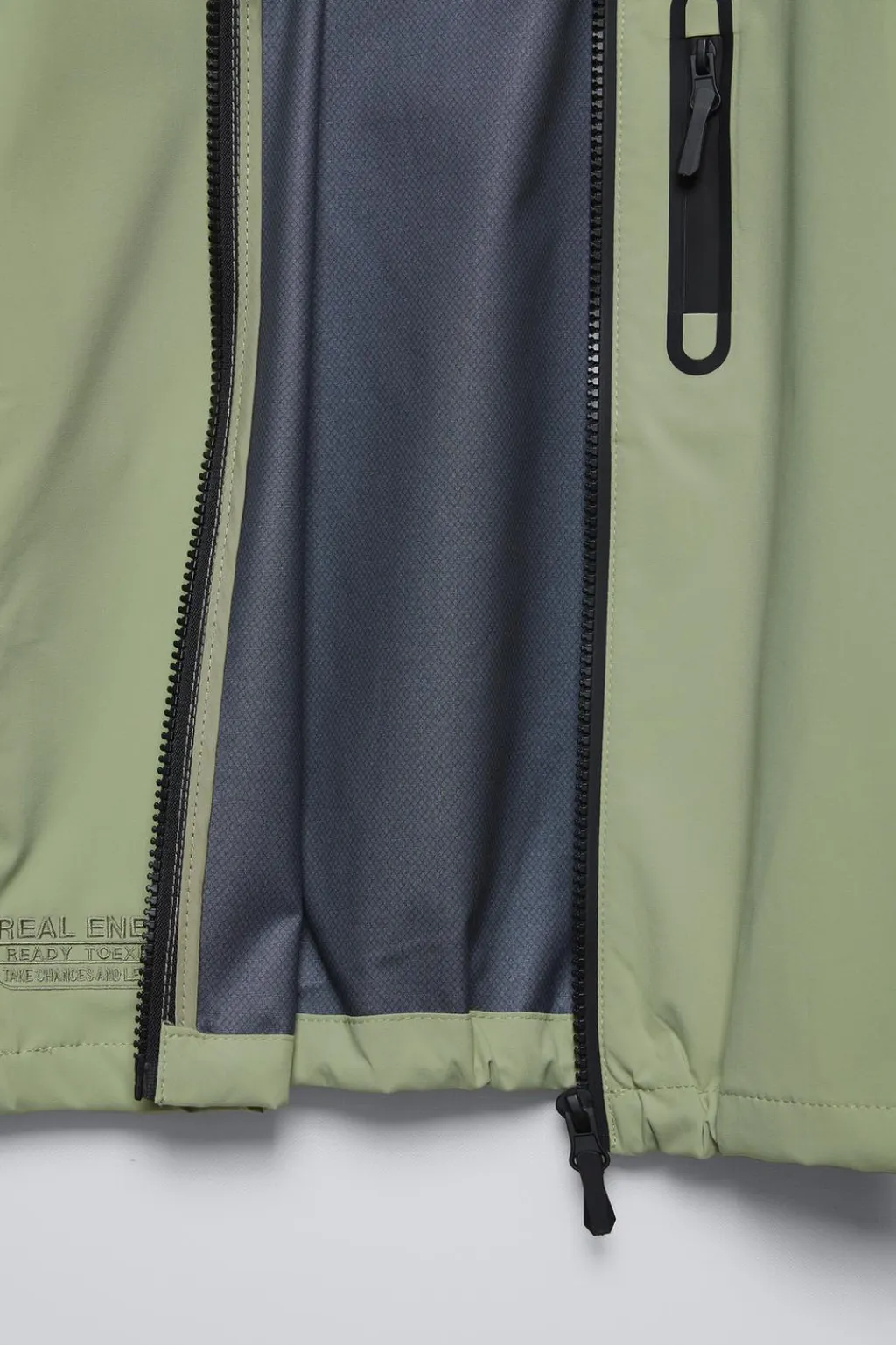 Chubasquero con capucha y manga larga ajustable en puño con autoadhesivo. Cierre frontal con cremallera termosellada. Bolsillo con cremallera en pechera y delantero. Motivo texto bordado. Bajo ajustable con goma y stoppers.