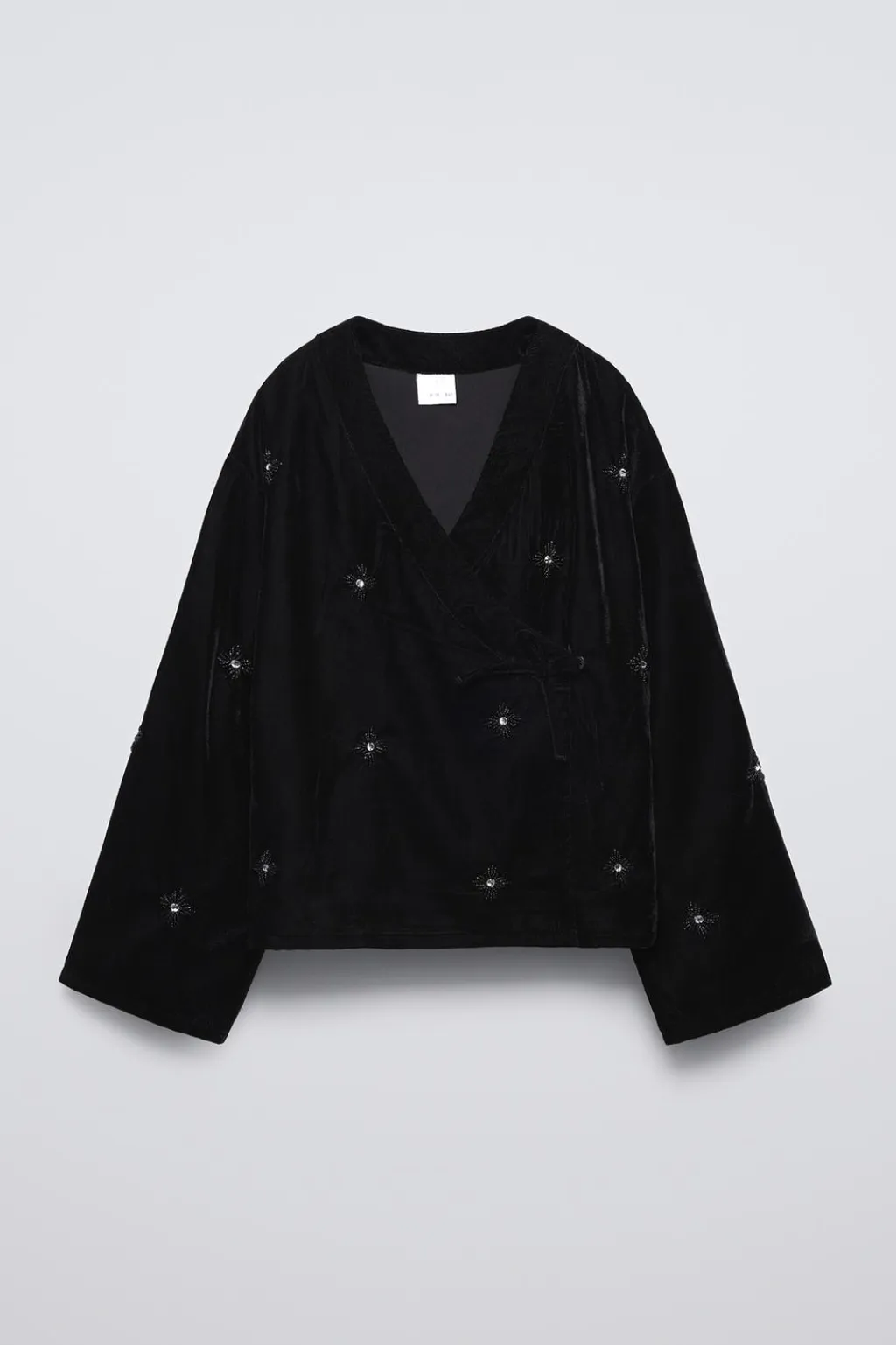 Kimono con cuello pico y cierre cruzado con botón presión, aplique lazo. Aplique abalorios en forma de flor en delantero.