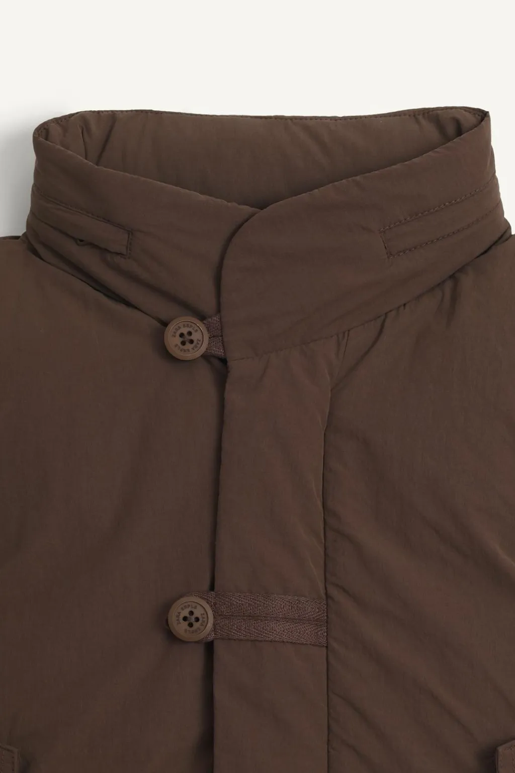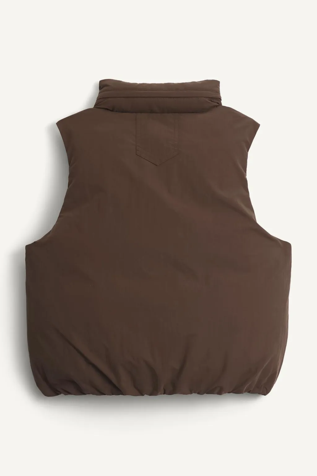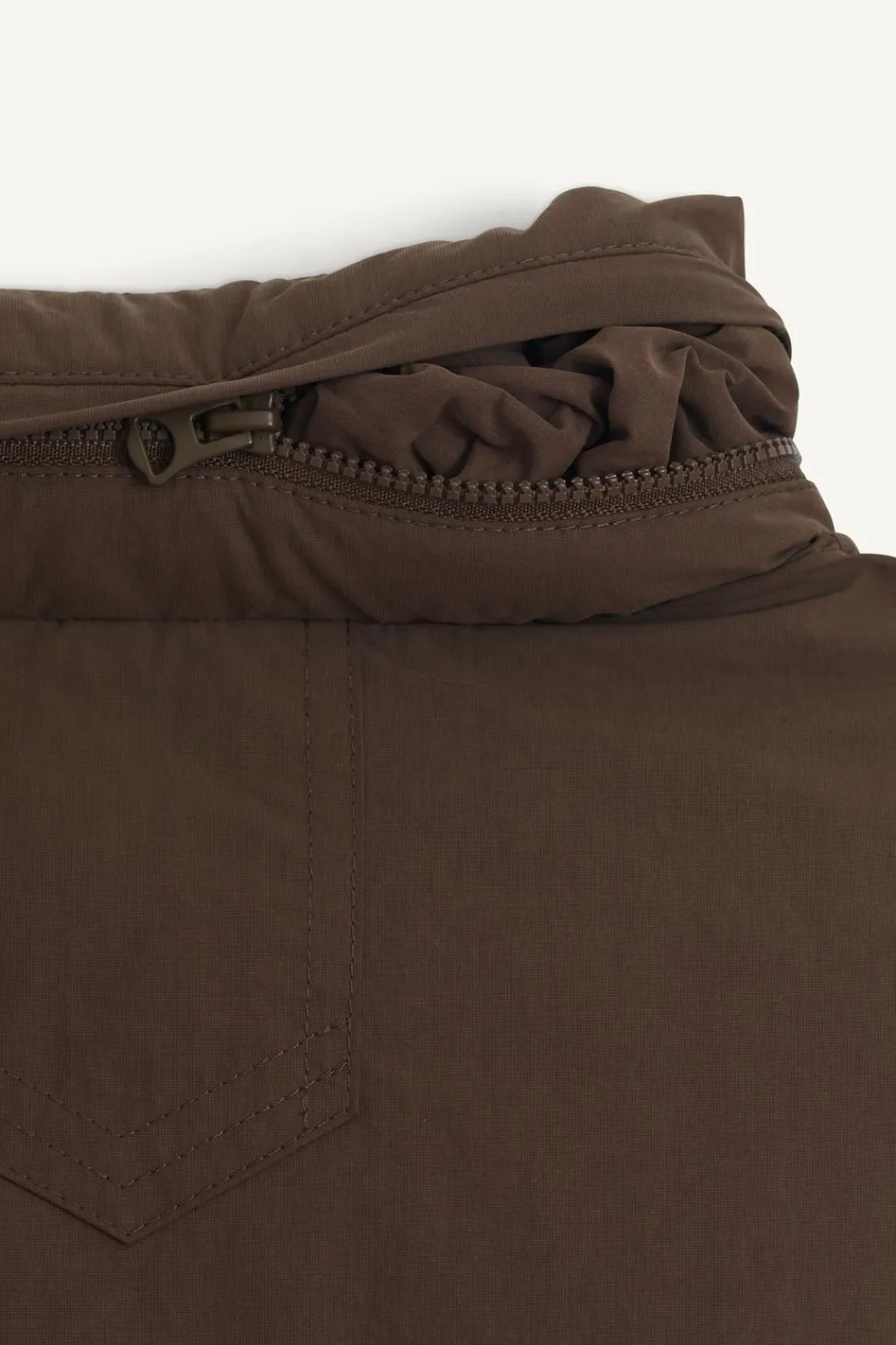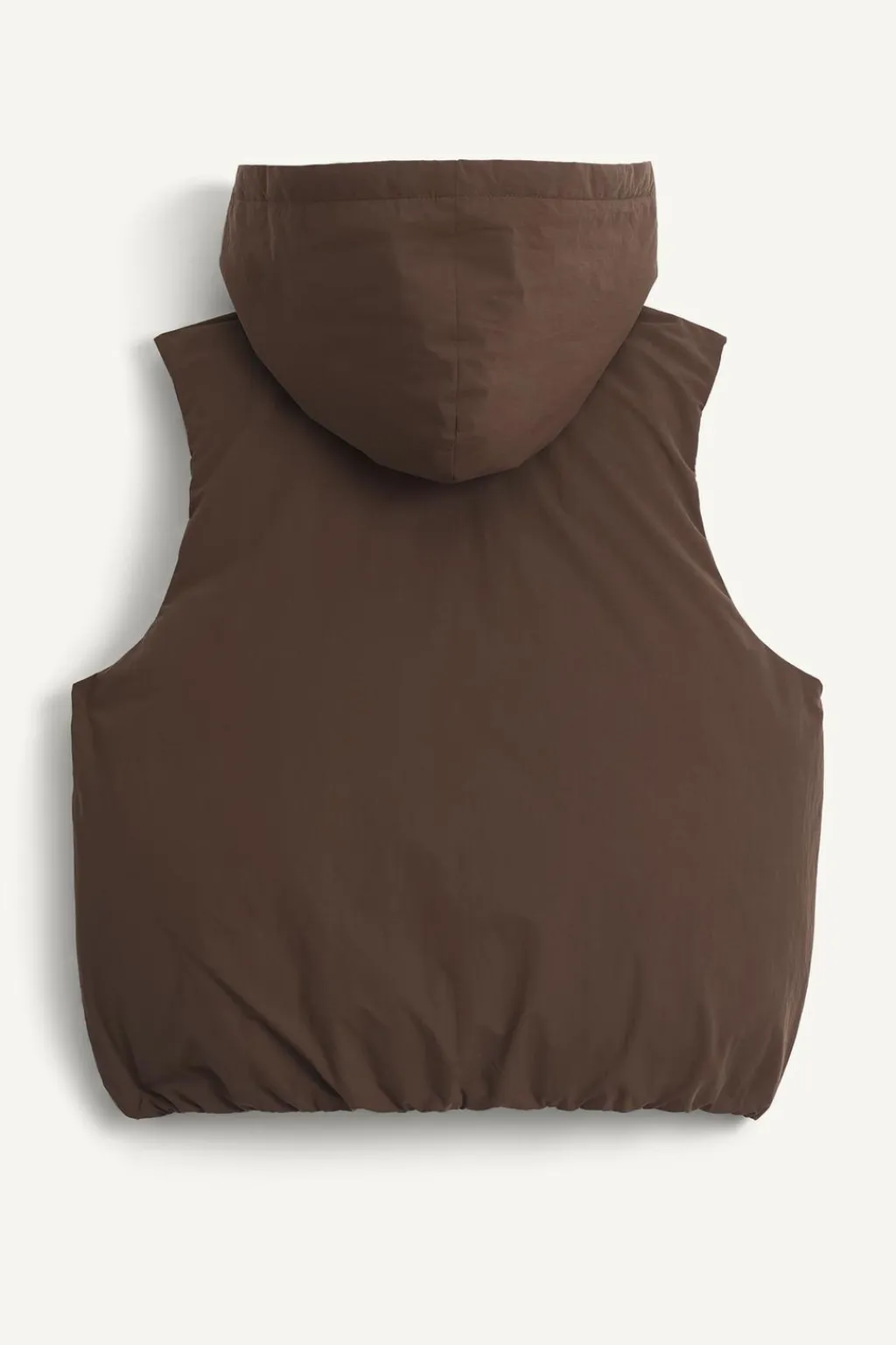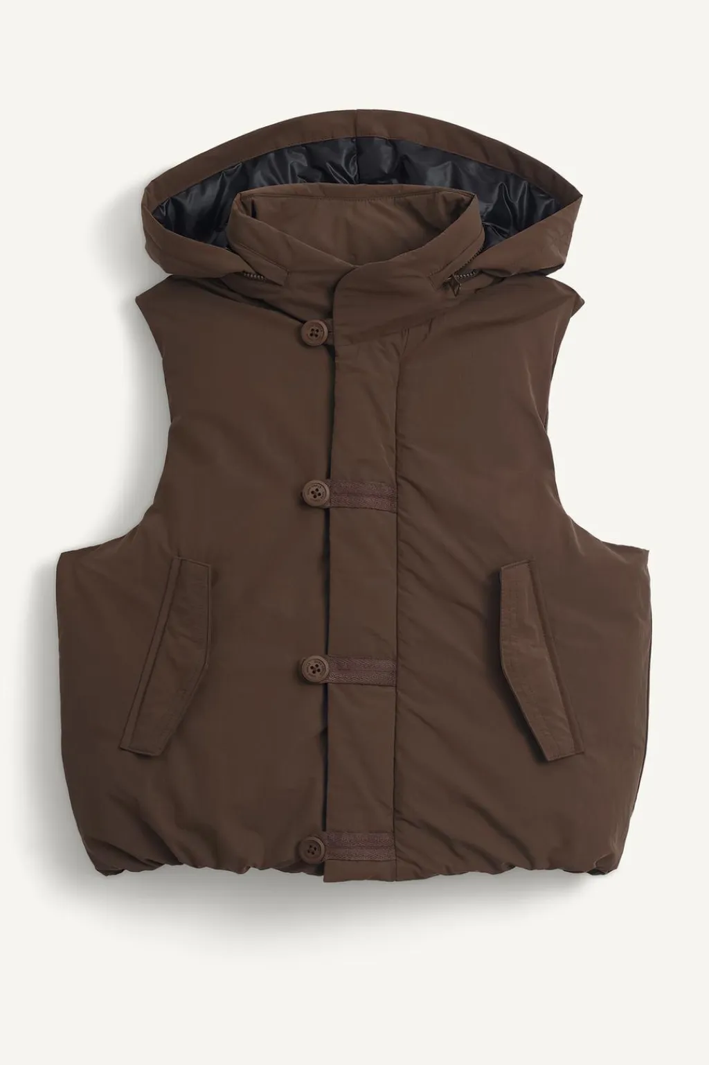 Chaleco acolchado con cuello subido, capucha oculta por cremallera y manga sisa. Cierre cremallera frontal oculta por solapa con cierre botones y detalle tiras. Bolsillos delanteros con tapeta y cierre botón presión. Forro interior combinado a tono.