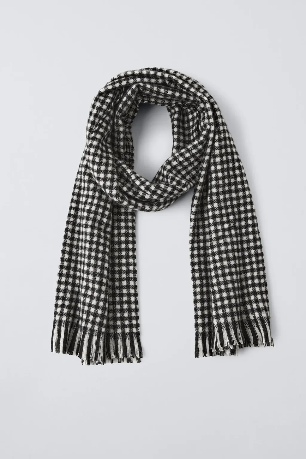 Bufanda de cuadros con un tejido tacto suave. Acabados en flecos.