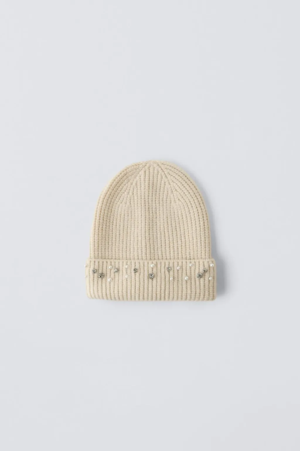 Gorro de punto con bajo acabado en vuelta. Aplique perlas.