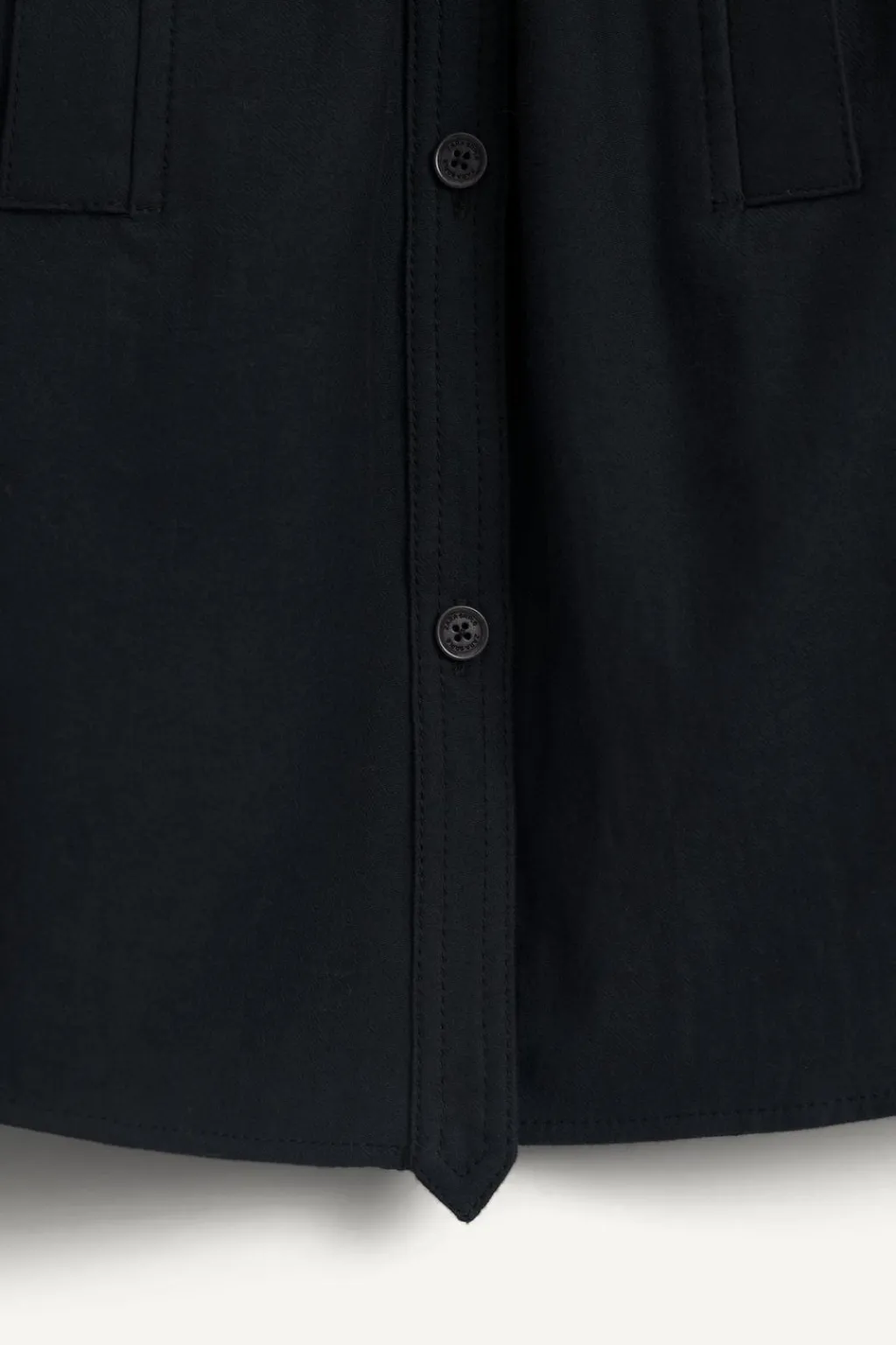 Camisa con cuello mao y manga larga acabada en cierre botón. Cierre de botonadura frontal. Bolsillos con detalle vivo en pechera. Detalle frunces en cuello y pliegue en espalda.