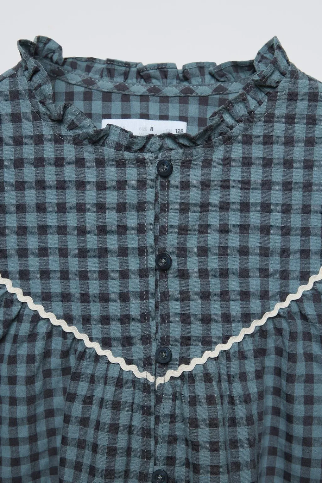 Camisa con cuello subido y manga larga acabada en volantes. Cierre botonadura frontal. Detalle vivo a contraste en canesú.