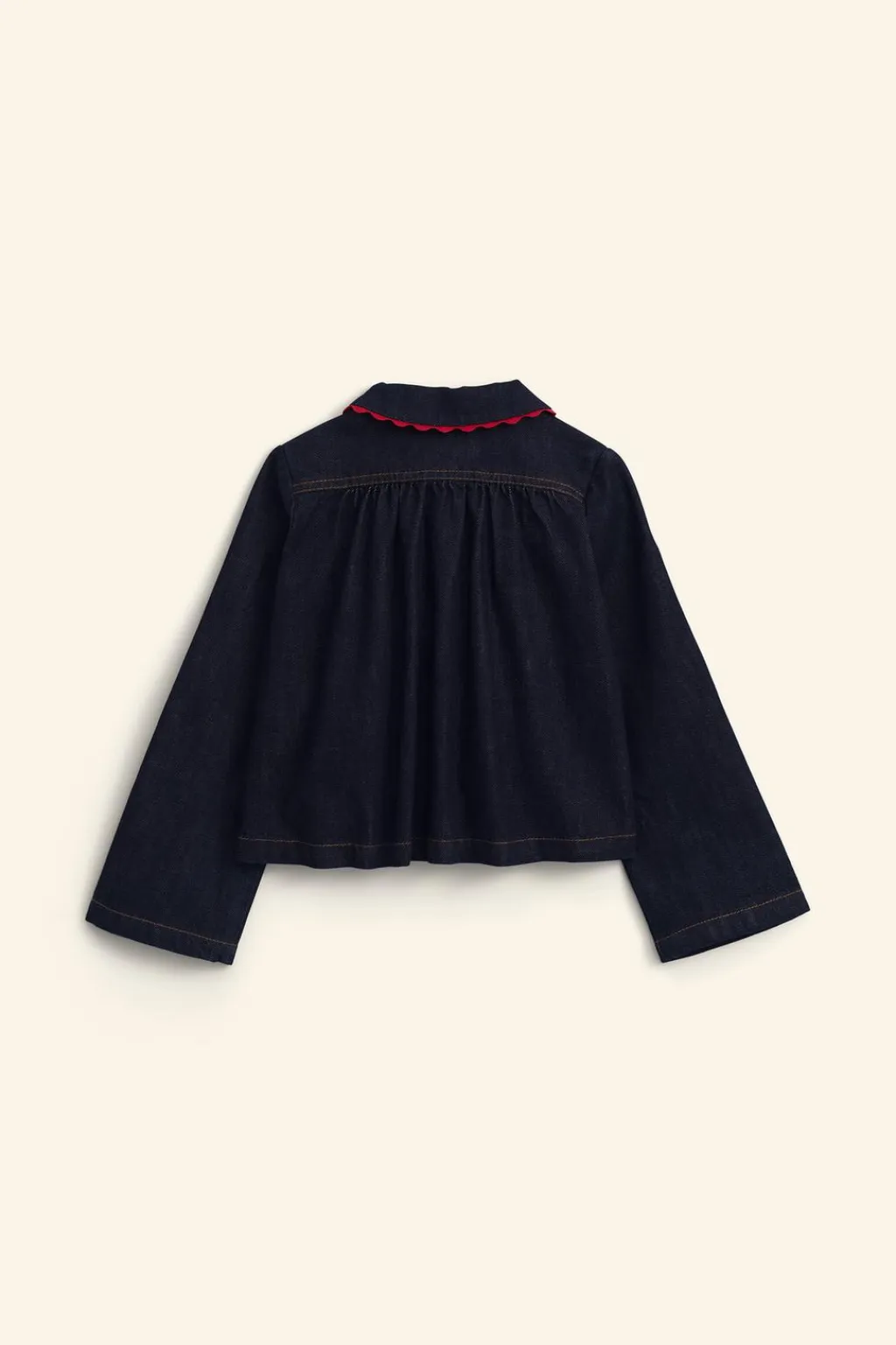 Camisa con cuello bobo, aplique ondas a contraste y manga larga. Cierre tipo lágrima con botón en pechera.