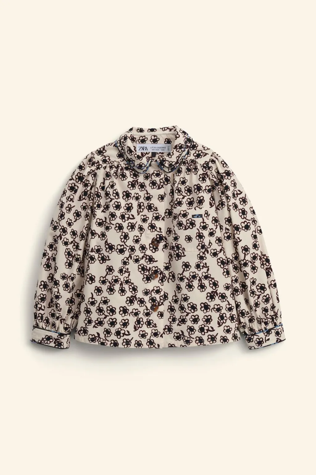 Camisa con doble cuello camisero y manga larga con detalle frunces. Cierre botonadura frontal en forma de flor oculta en canesú. Bolsillo de tipo plastrón en pechera.
