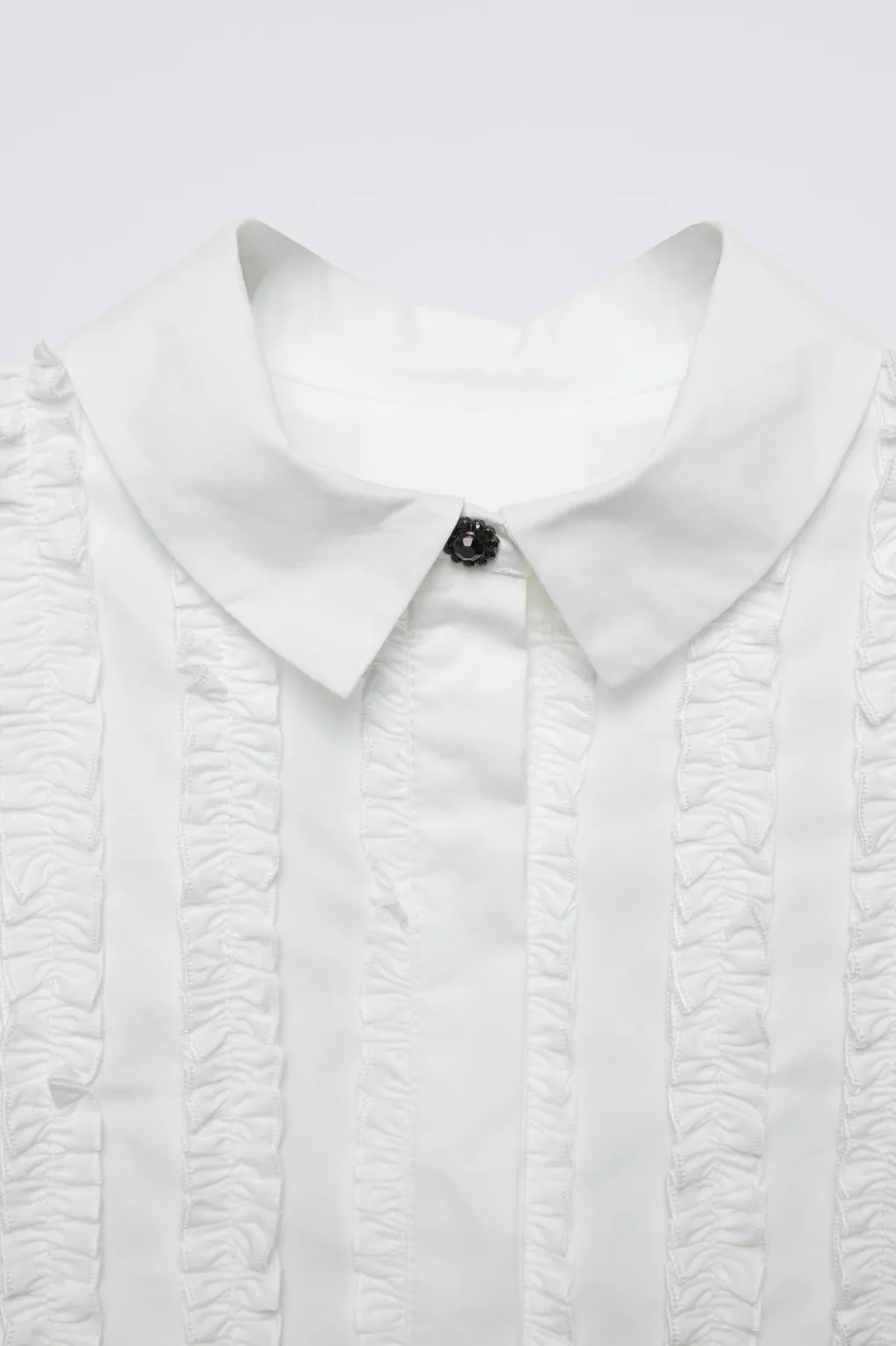 Camisa con cuello camisero y manga larga acabada en cierre botón en forma de flor brillante. Cierre botonadura frontal oculta por solapa. Detalle chorreras en delantero.
