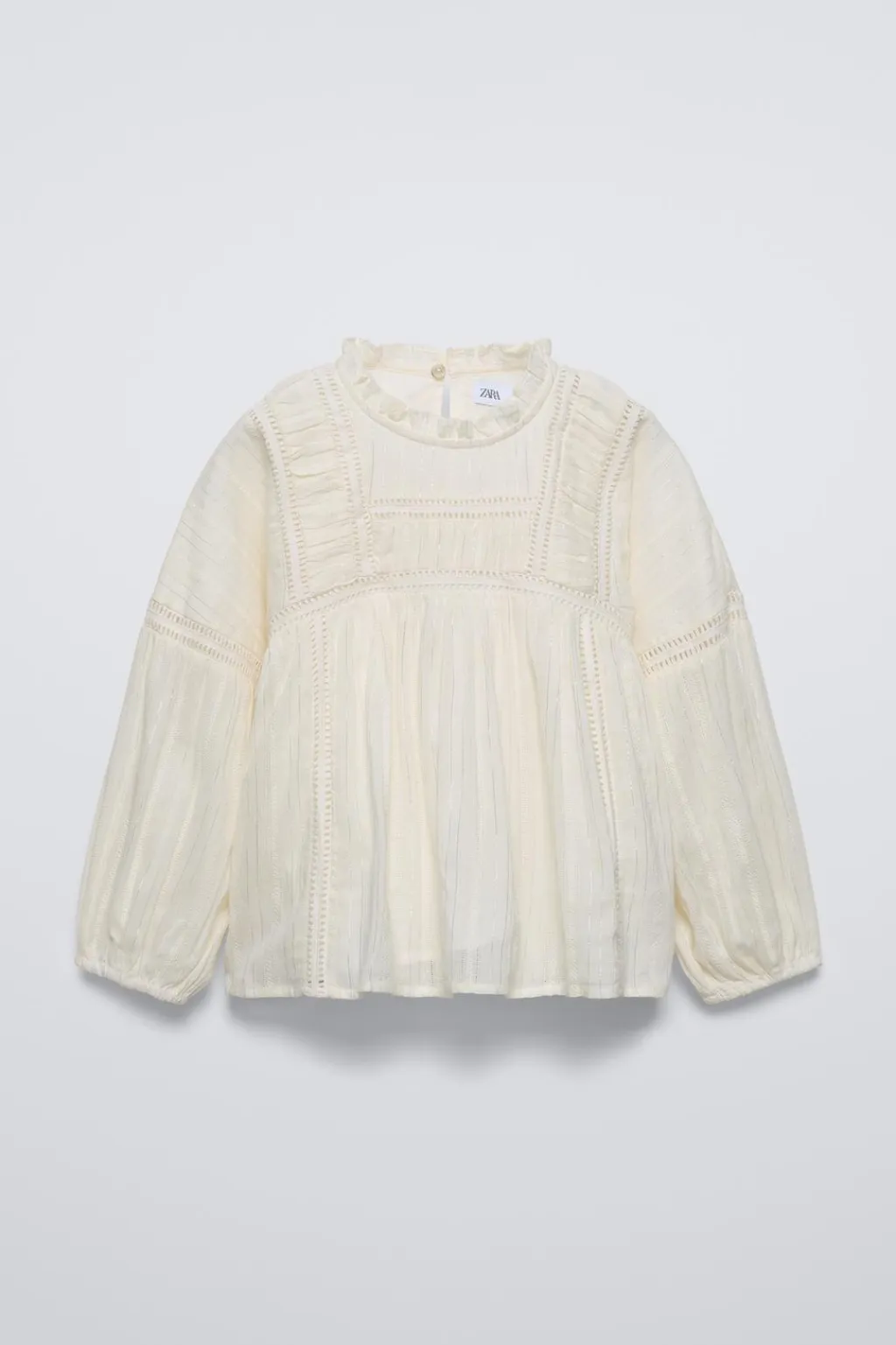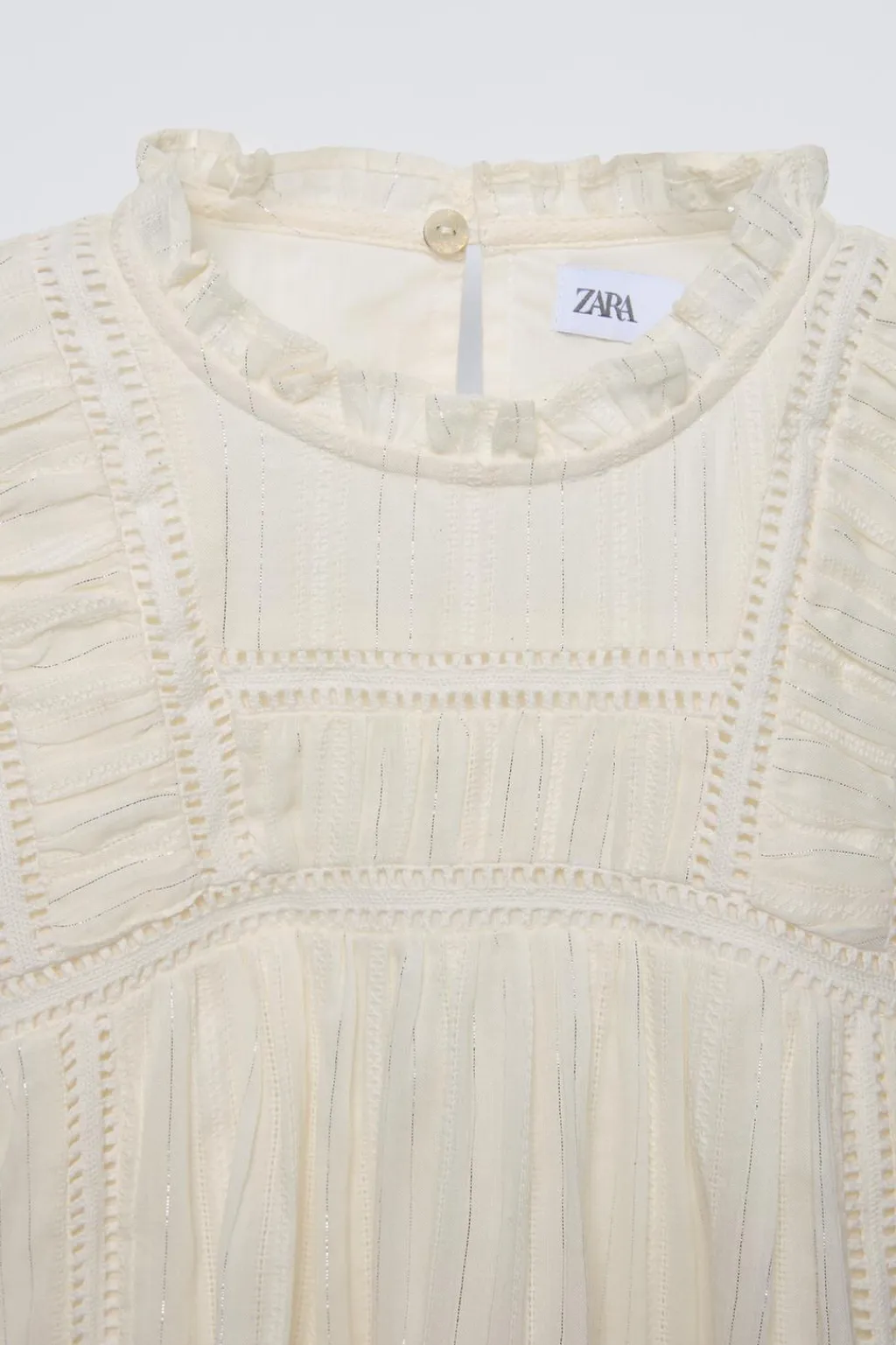 Camisa con cuello redondo, detalle volantes y manga larga acabada en goma. Cierre tipo lágrima con botón en espalda. Detalle brillo. Forro interior combinado a tono.
