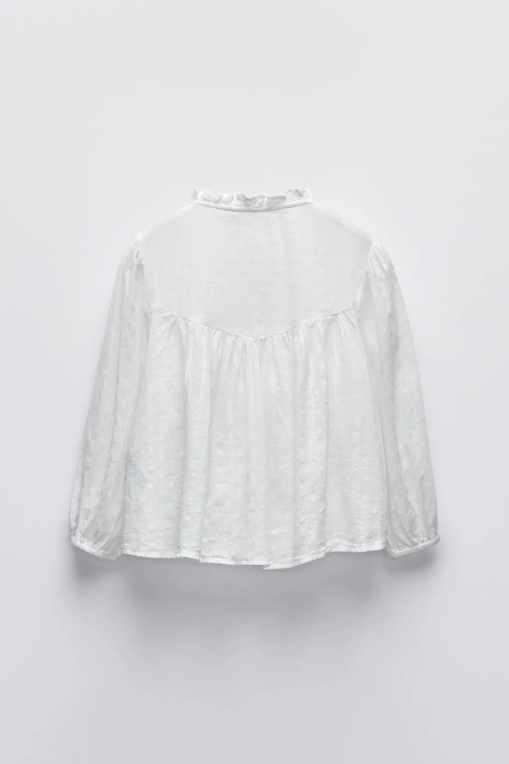 Camisa con cuello rizo y manga larga acabada en goma. Cierre con botonadura frontal. Detalle entredós en canesú.