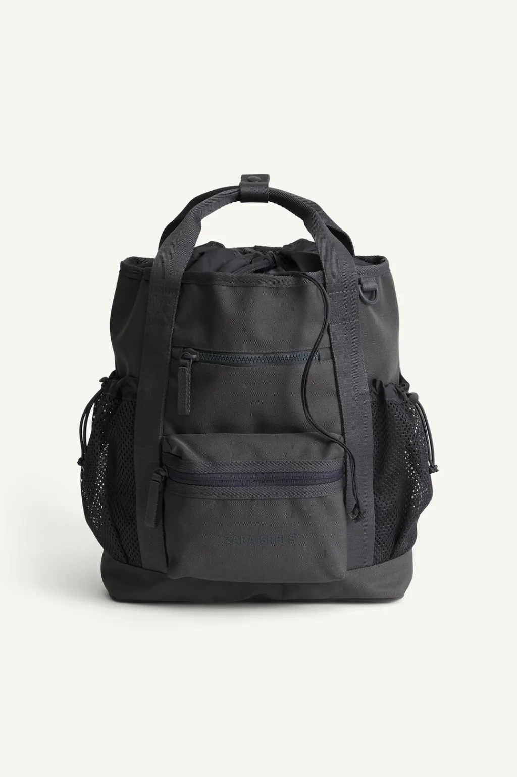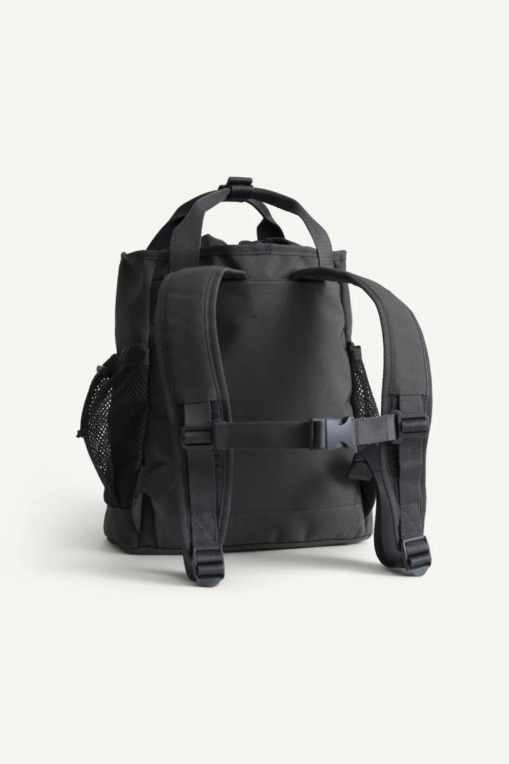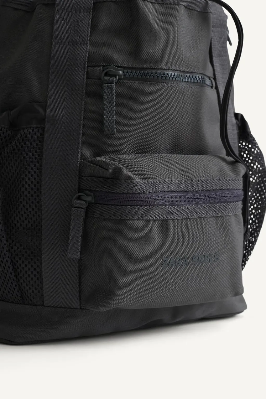 Mini mochila tipo explorer. Compartimento principal con cierre mediante frunce stopper deportivo. Cuenta con dos bolsillos laterales rejilla y un bolsillo frontal. En su interior, cuenta con un bolsillo sin cierre. En la parte trasera cuenta con un bolsillo con cierre mediante tira adherente. Doble asa grande de mano y dos asas de hombro ajustables y una correa con cierre deportivo para el pecho.