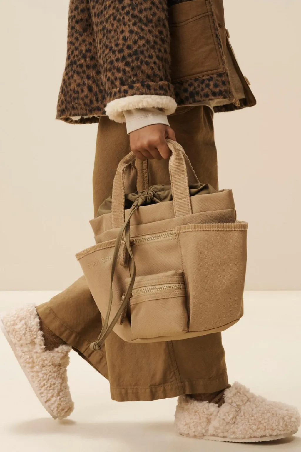Mini bolso tipo shopper de algodón. Saca interior de tejido con cierre mediante frunce. Cuenta con dos bolsillos frontales sin cierre y otros dos con cierre mediante cremallera. Doble asa de mano.