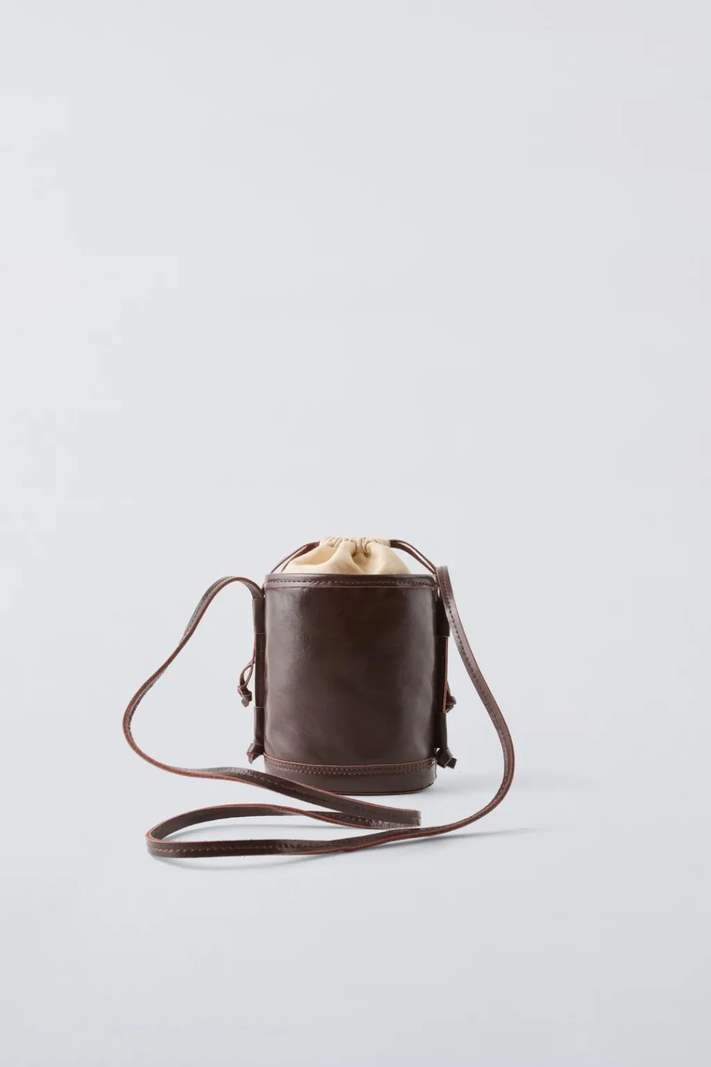 Bolso tipo bandolera en formato de cubo con piel vacuno. Cuenta con una bolsa interior con cierre mediante cuerdas y asa de hombro.