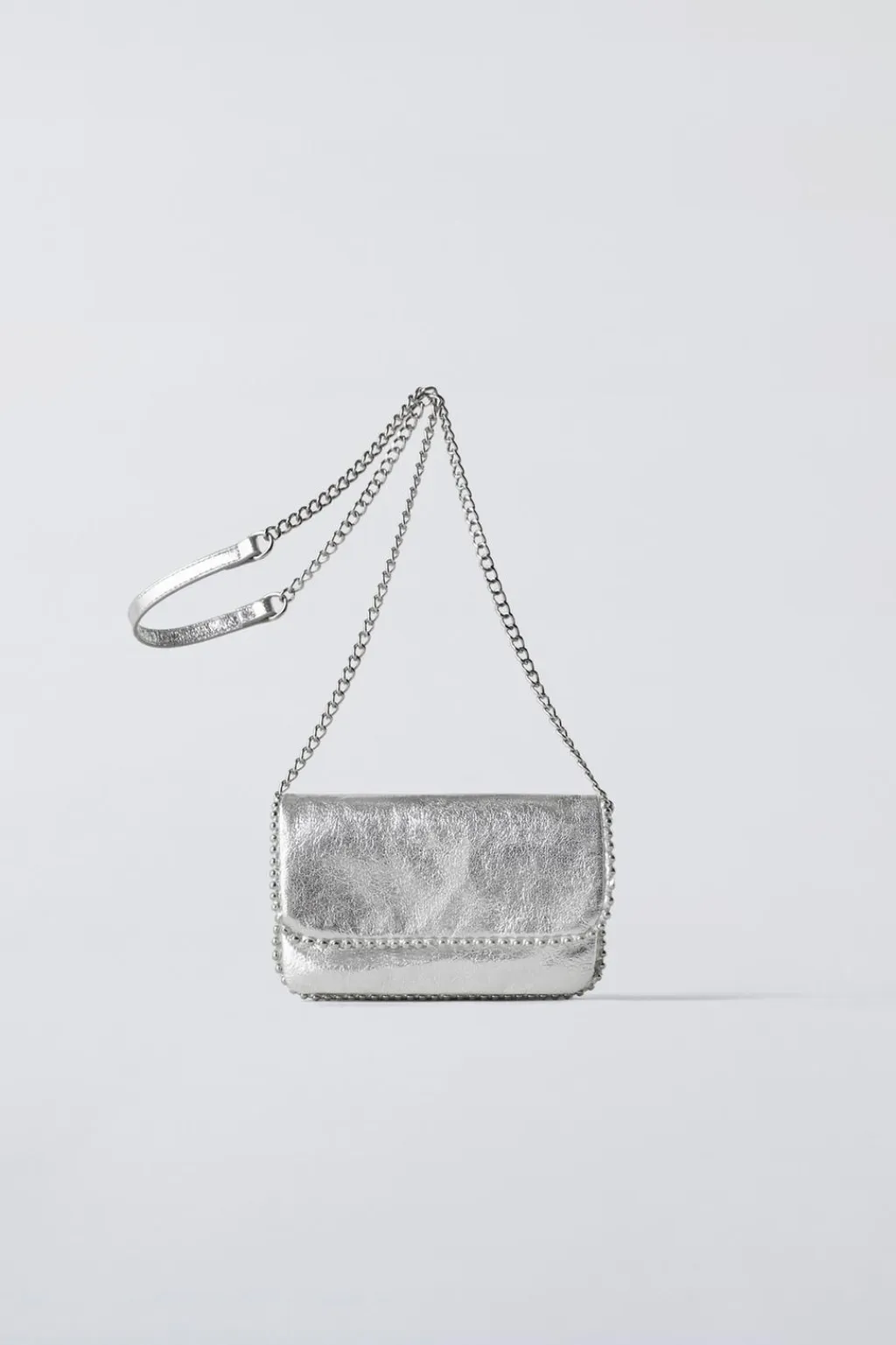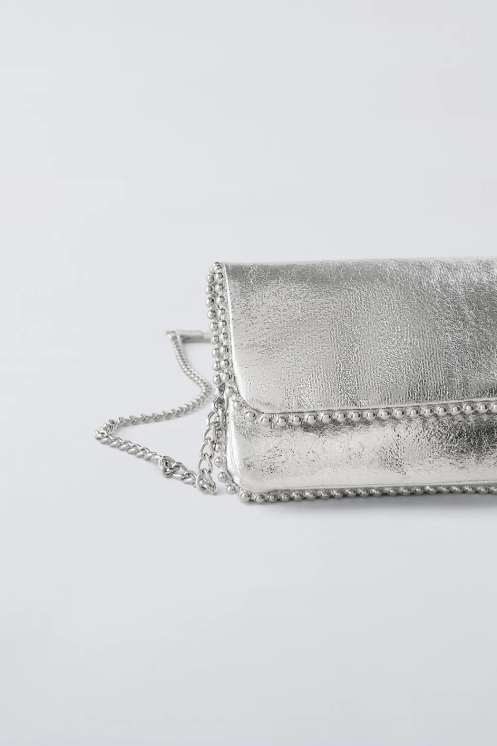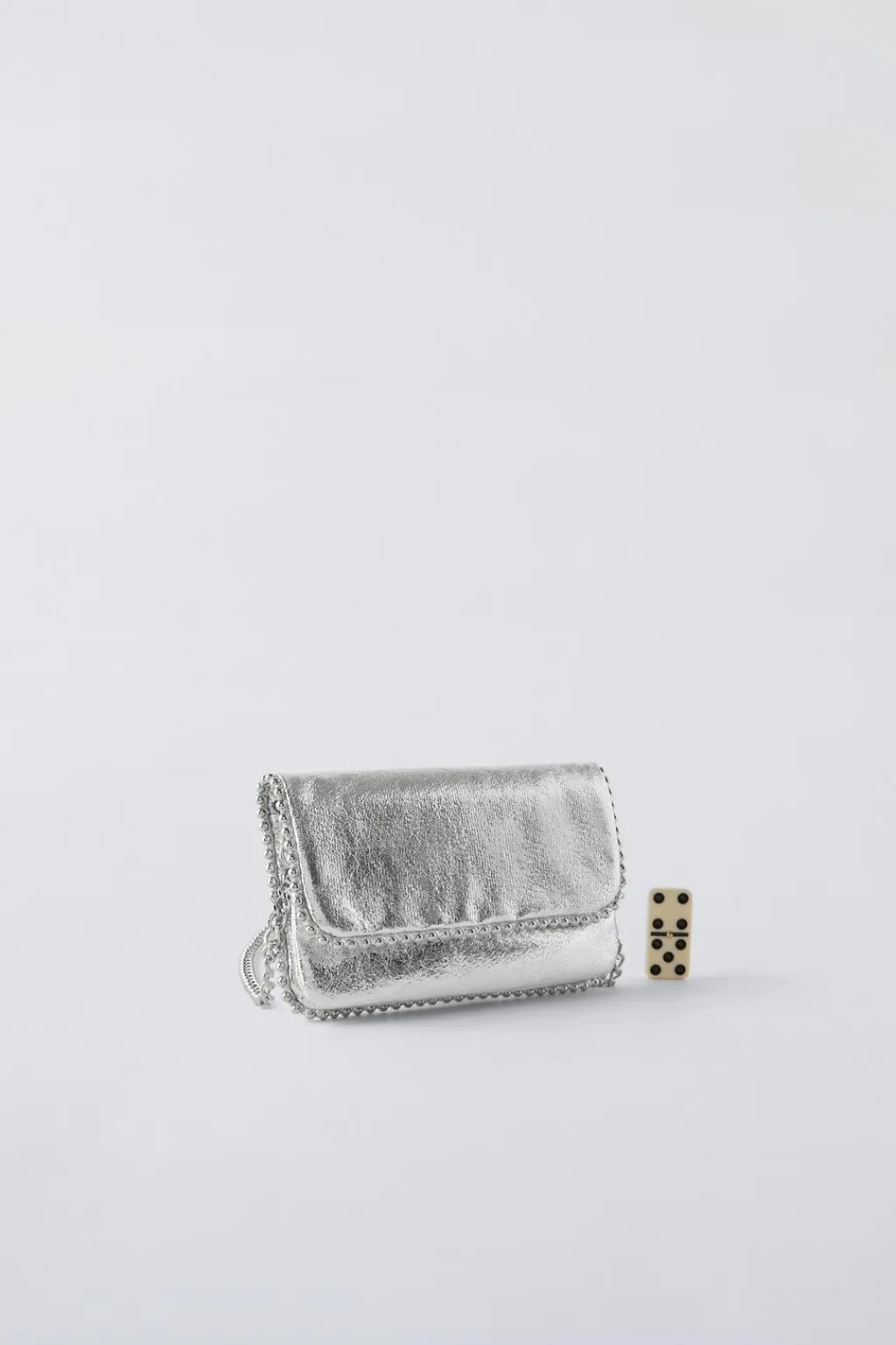 Bolso tipo bandolera metalizado. Compartimento principal tipo sobre con cierre mediante clip. Doble compartimento interior con cierre mediante cremallera. Asa de hombro en cadena.