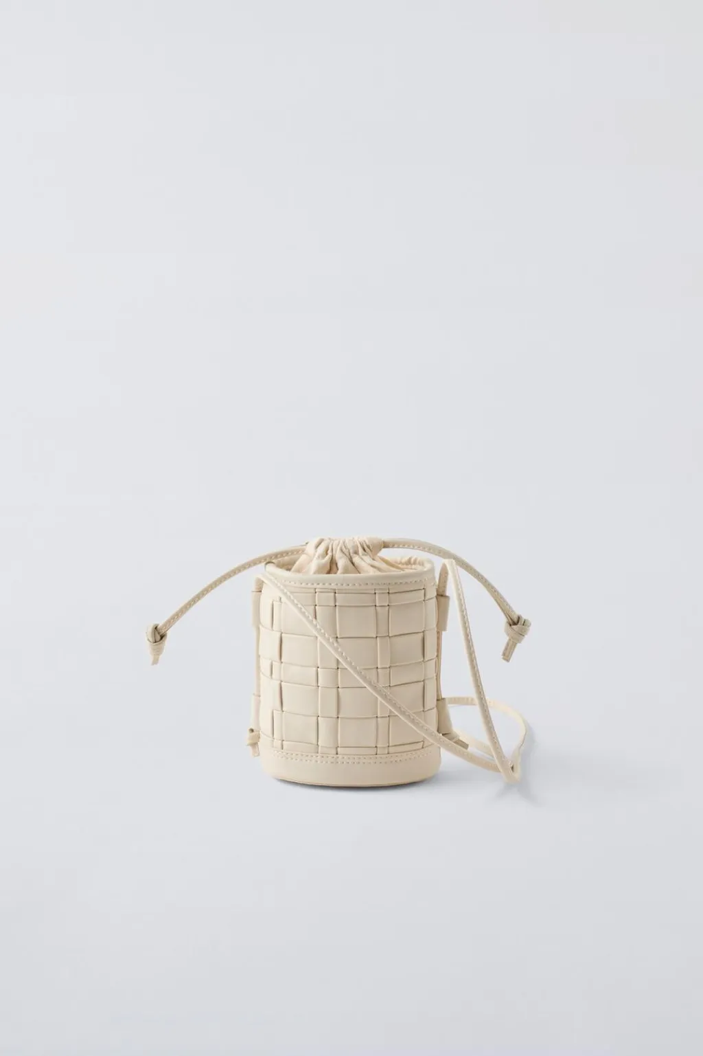 Bolso tipo bandolera en formato de cubo con acabado trenzado. Cuenta con una bolsa interior con cierre mediante cuerdas y asa de hombro.