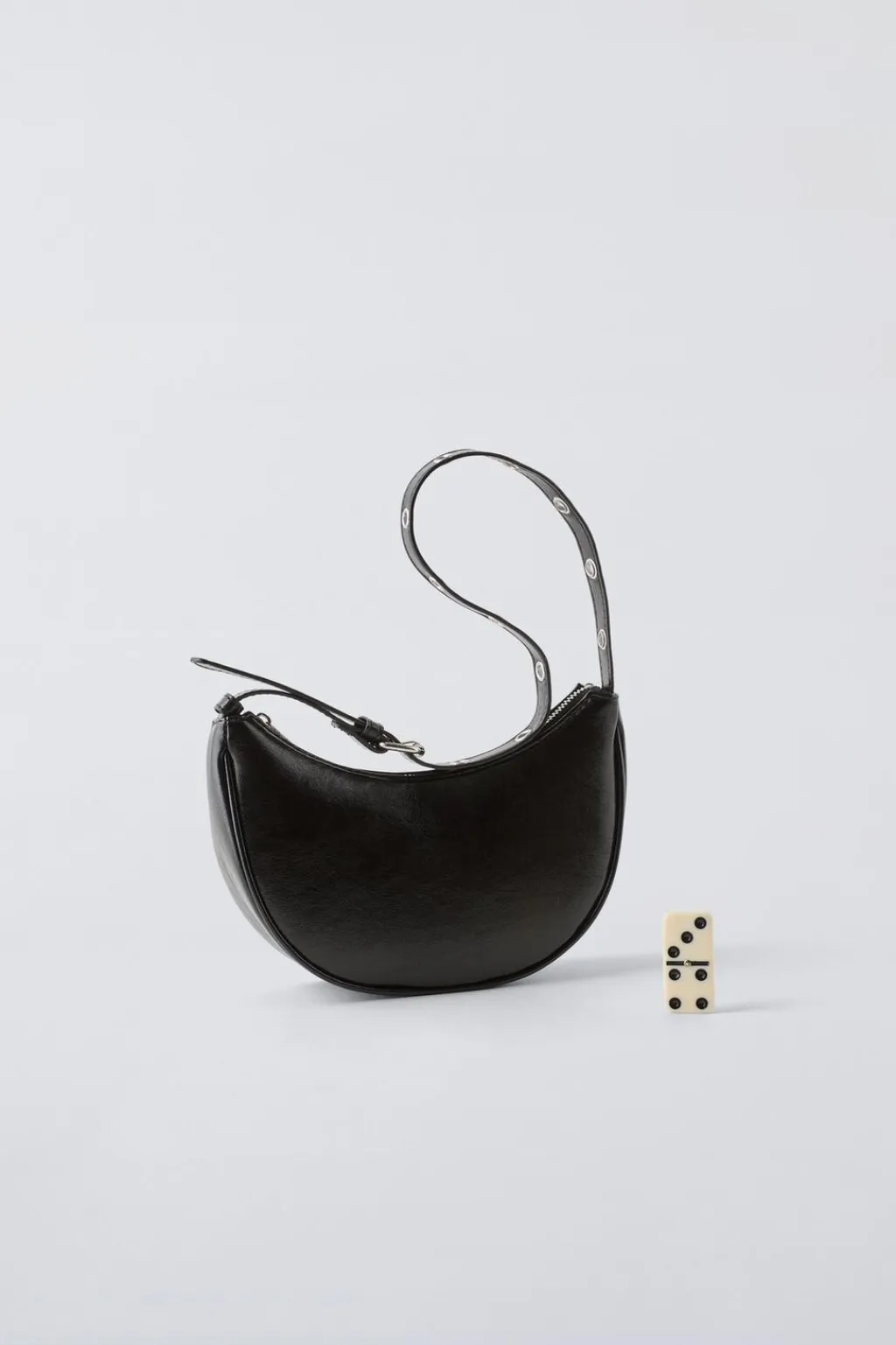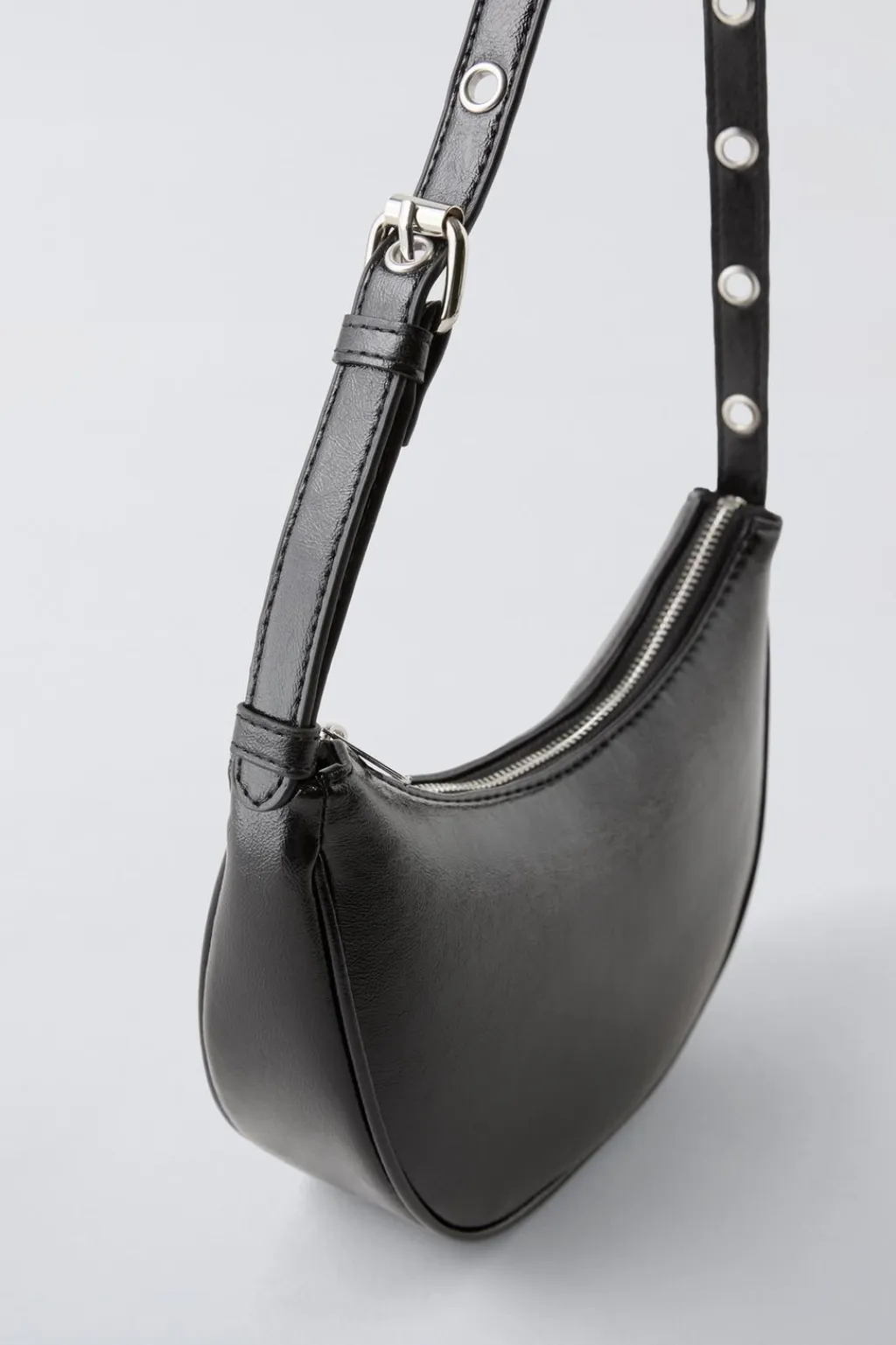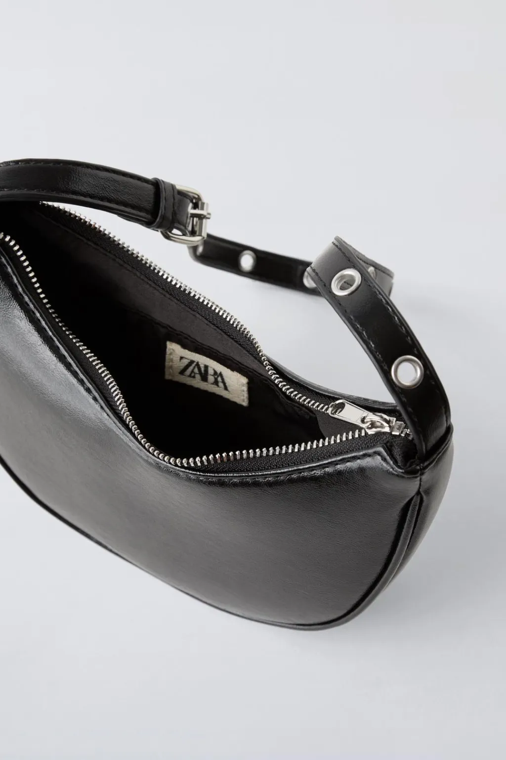 Bolso de hombro acharolado. Cierre mediante cremallera. Asa de hombro ajustable.