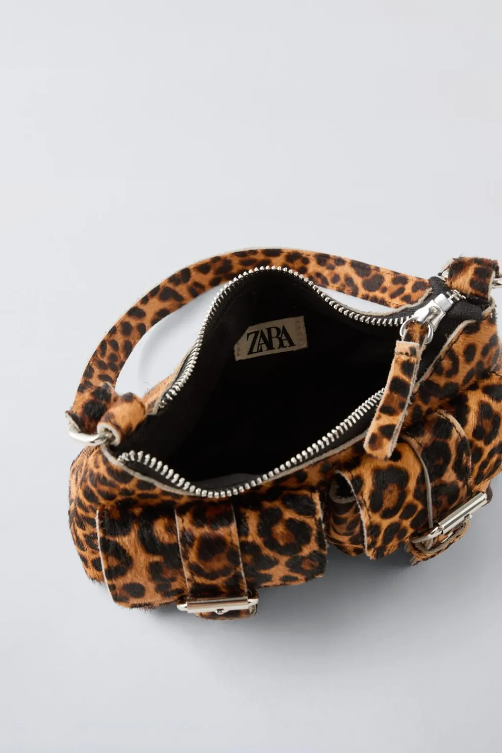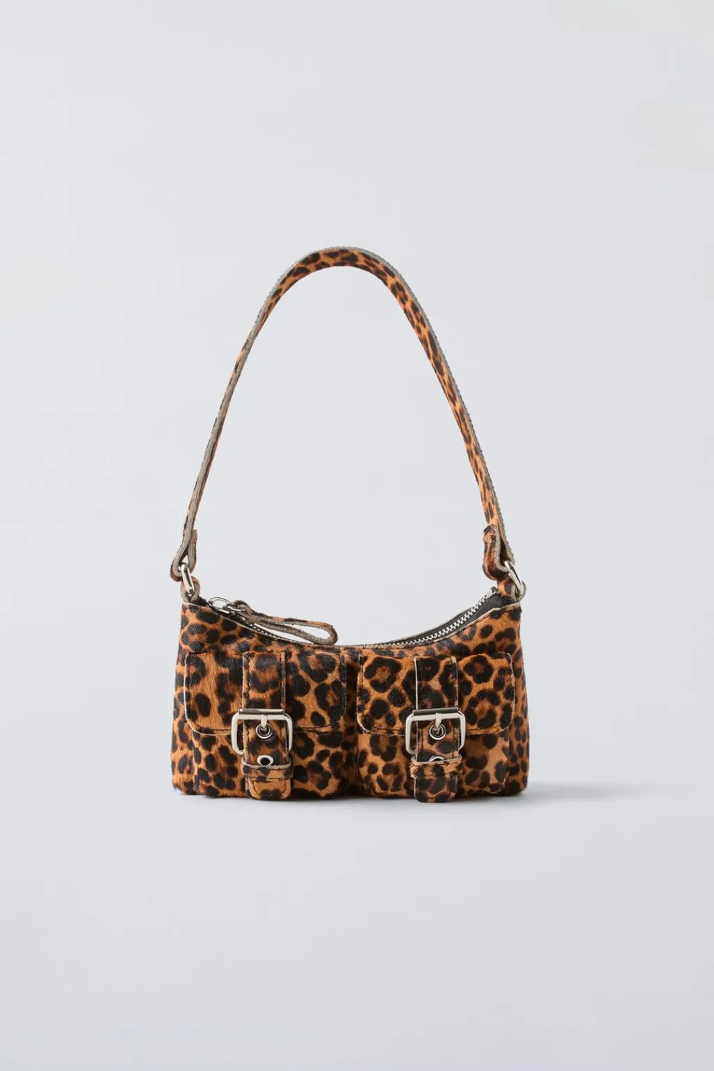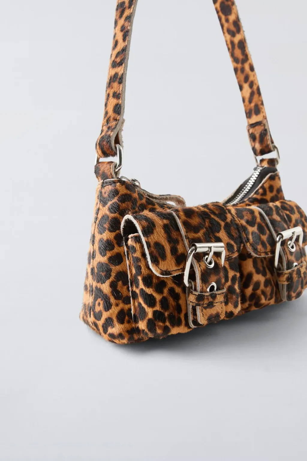 Bolso hombro animal print 100% piel con pelo de vaca. Compartimento principal con cierre mediante cremallera. Cuenta con dos bolsillos frontales con cierre mediante hebilla. Asa de hombro.