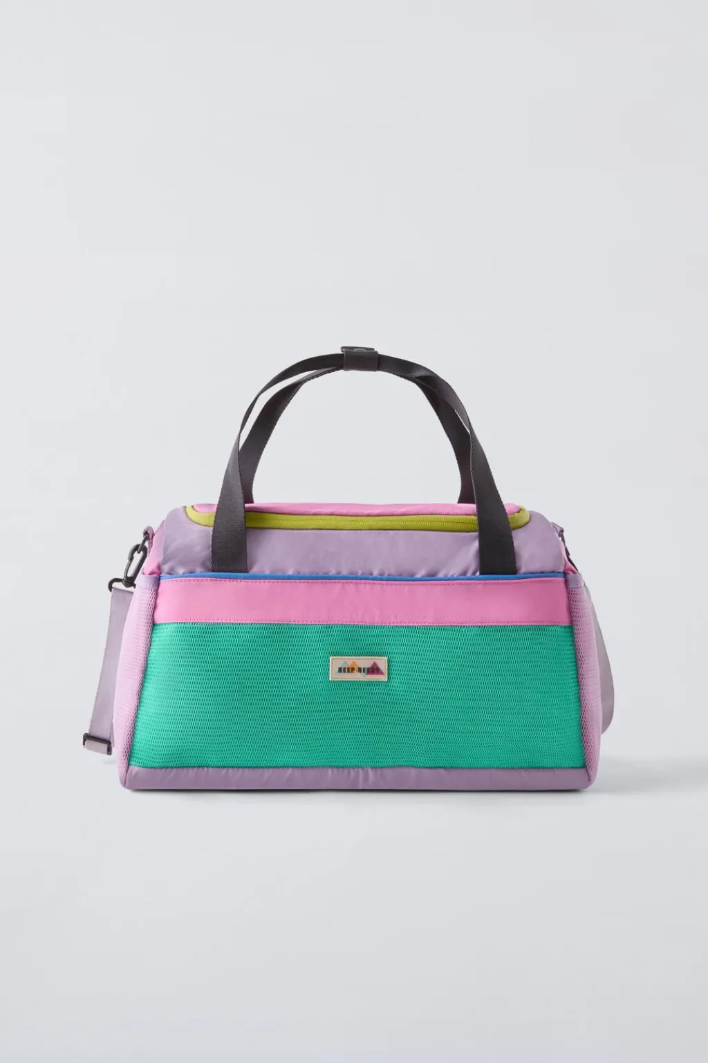 Bolso tipo bowling multicolor. Compartimento principal con cierre mediante cremallera. Cuenta con dos bolsillos laterales de rejilla. Doble asa de mano y asa de hombro ajustable y extraíble.