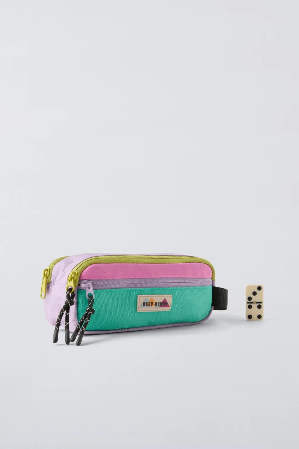 Estuche escolar multicolor. Doble compartimento principal con cierre mediante cremallera. Cuenta un compartimento frontal adicional con cierre mediante cremallera. Asa de mano.