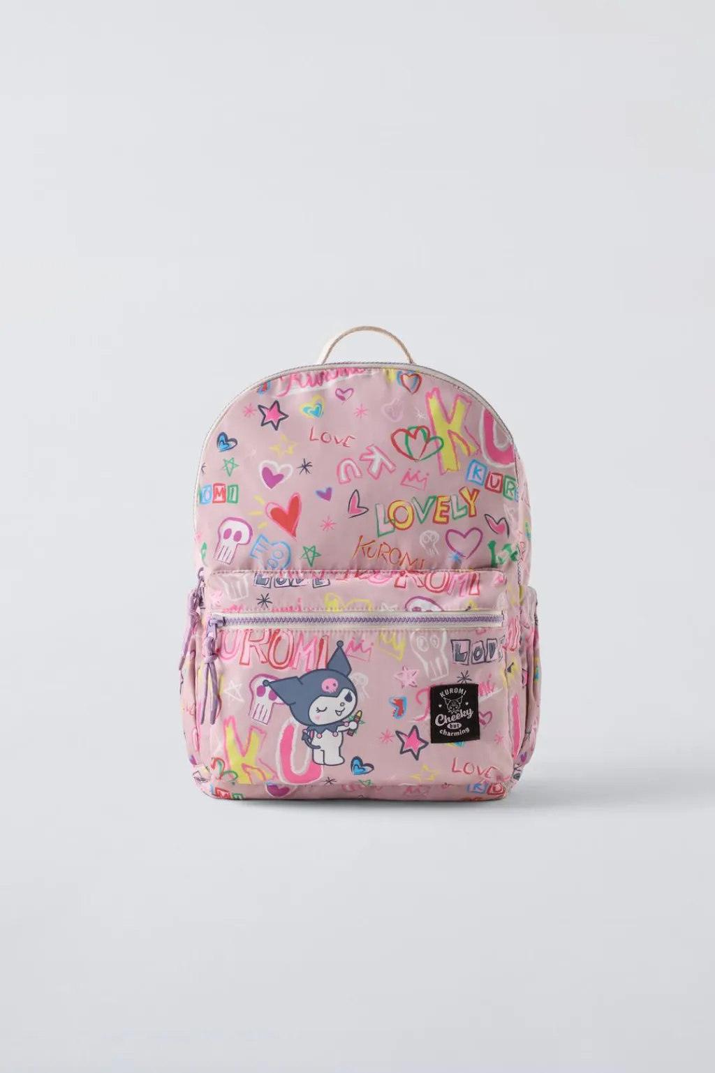 Mochila GRAFFITI KUROMI © SANRIO. Compartimento principal con cierre mediante cremallera. Cuenta con dos bolsillos laterales sin cierre y un bolsillo frontal con cierre mediante cremallera. Asa de mano y doble asa de hombro ajustable.