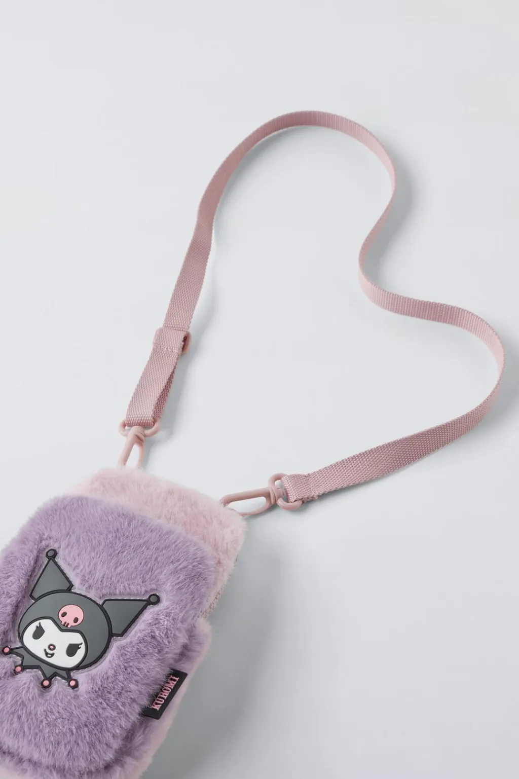 Funda porta móvil formato bandolera con pelo KUROMI © SANRIO. Compartimento principal con cierre mediante cremallera. Bolsillo adicional en la parte frontal con cierre mediante cremallera. Cuenta con pantalla táctil en la parte posterior. Asa de hombro ajustable y extraíble.