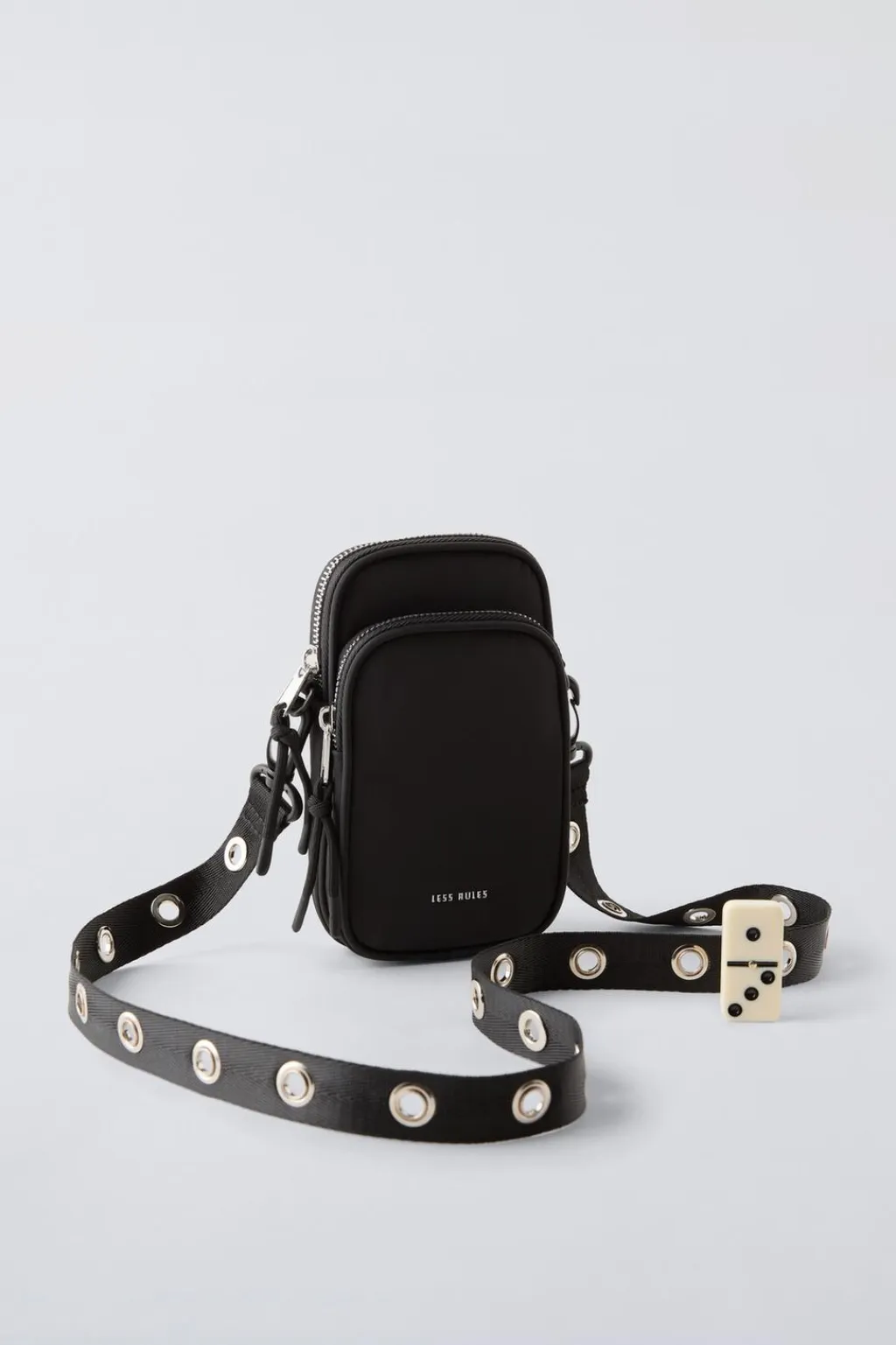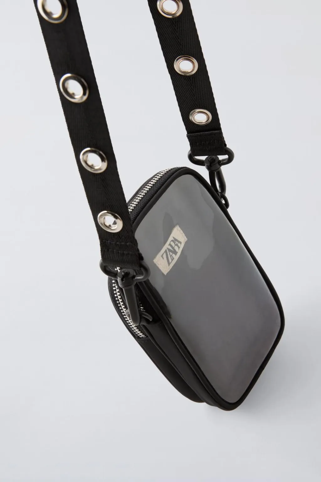 Funda porta móvil formato bandolera. Compartimento principal con cierre mediante cremallera. Bolsillo adicional en la parte frontal con cierre mediante cremallera. Cuenta con pantalla táctil en la parte posterior. Asa de hombro con detalle en tachas ajustable y extraíble.