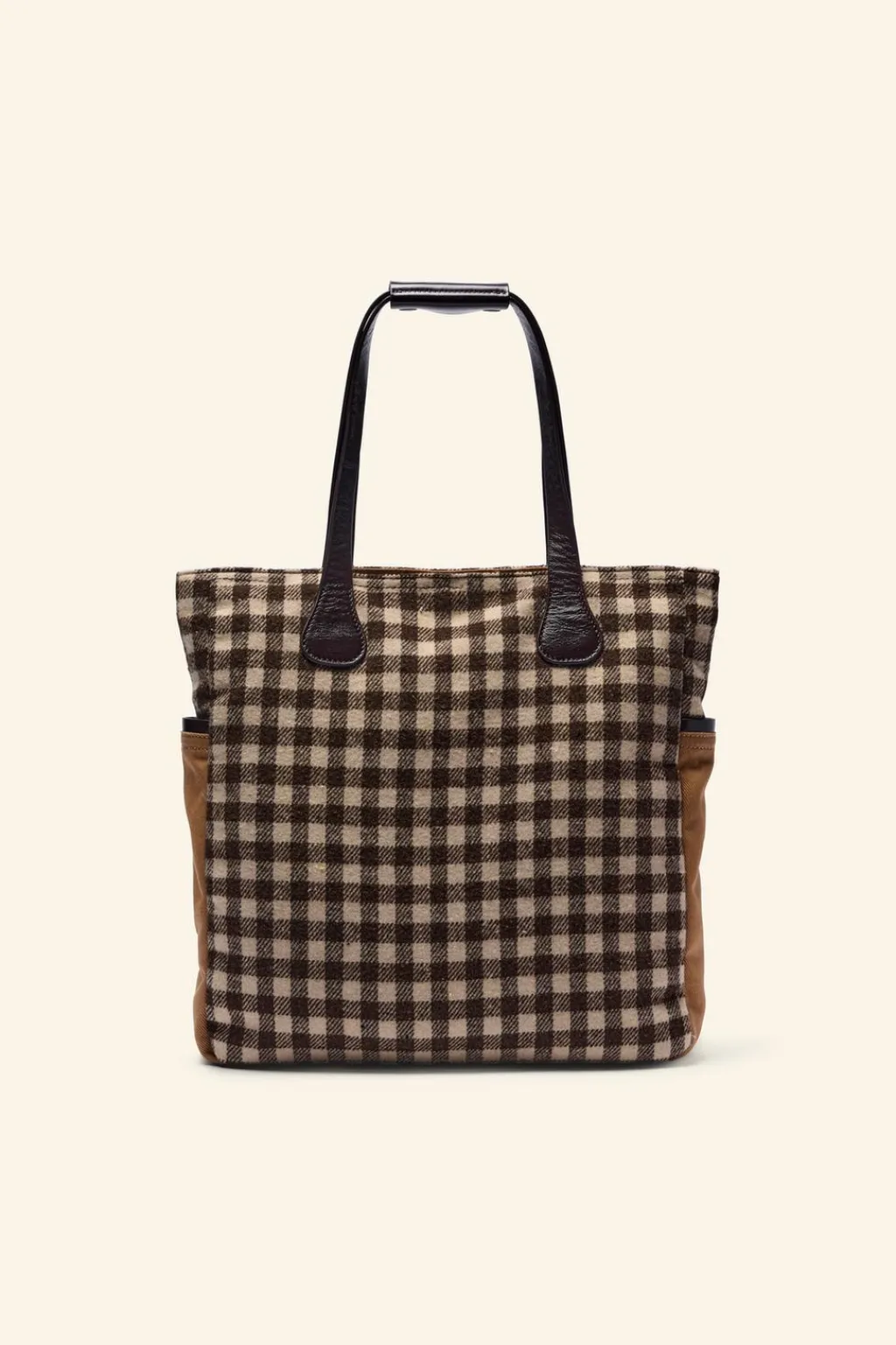 Bolso tipo shopper con estampado vichy. Compartimento principal con cierre mediante imán. En la parte frontal cuenta con dos bolsillos sin cierre y en los laterales cuenta con dos bolsillo sin cierre. Doble asa de hombro.