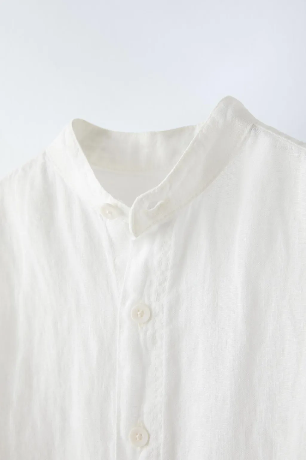Camisa de lino con cuello mao y manga corta. Cierre botonadura frontal.