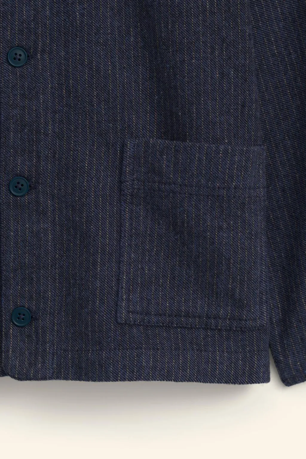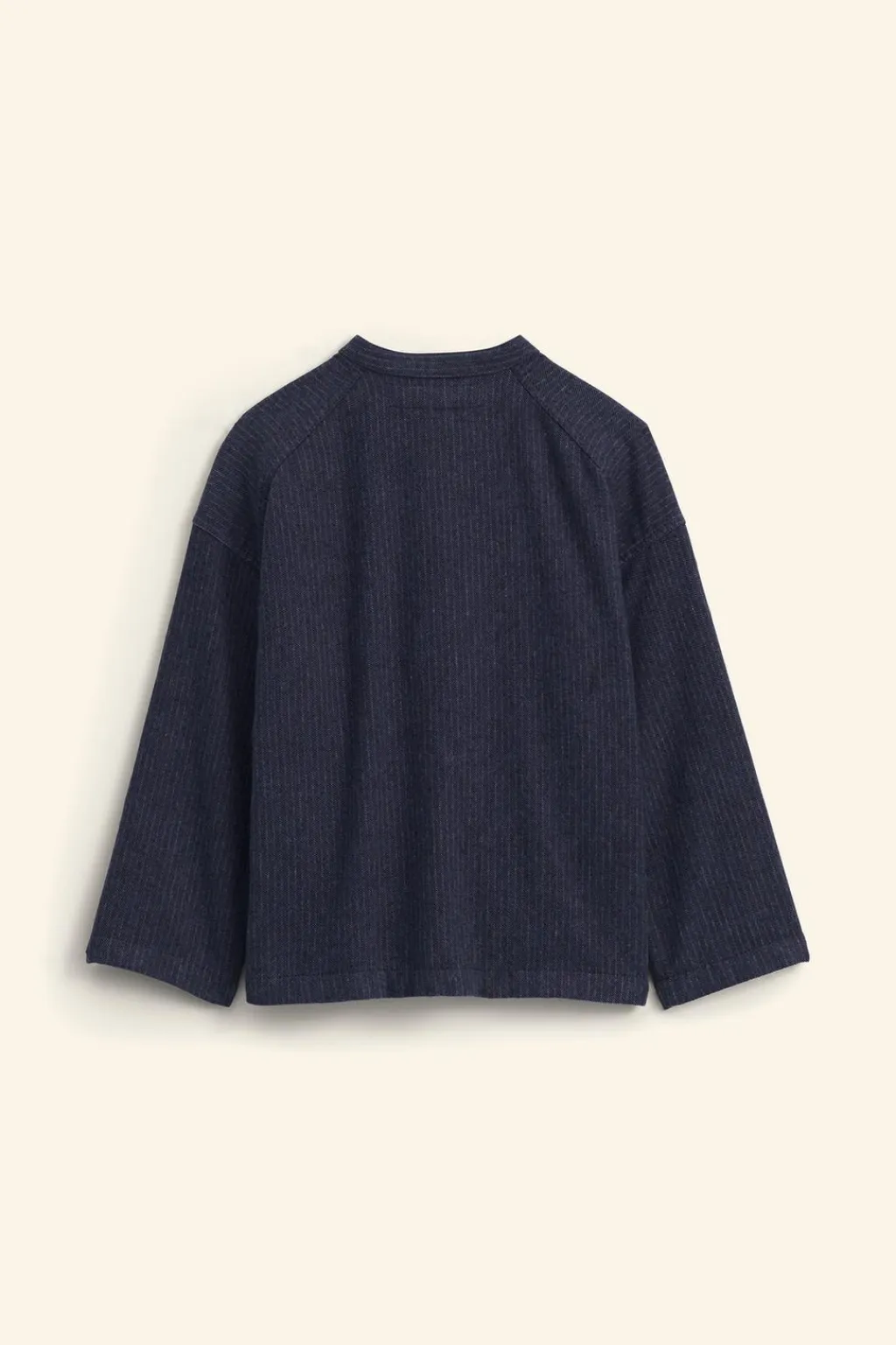 Camisa con cuello mao y manga larga. Cierre botonadura frontal. Bolsillos de tipo plastrón en delantero. Estampado rayas.