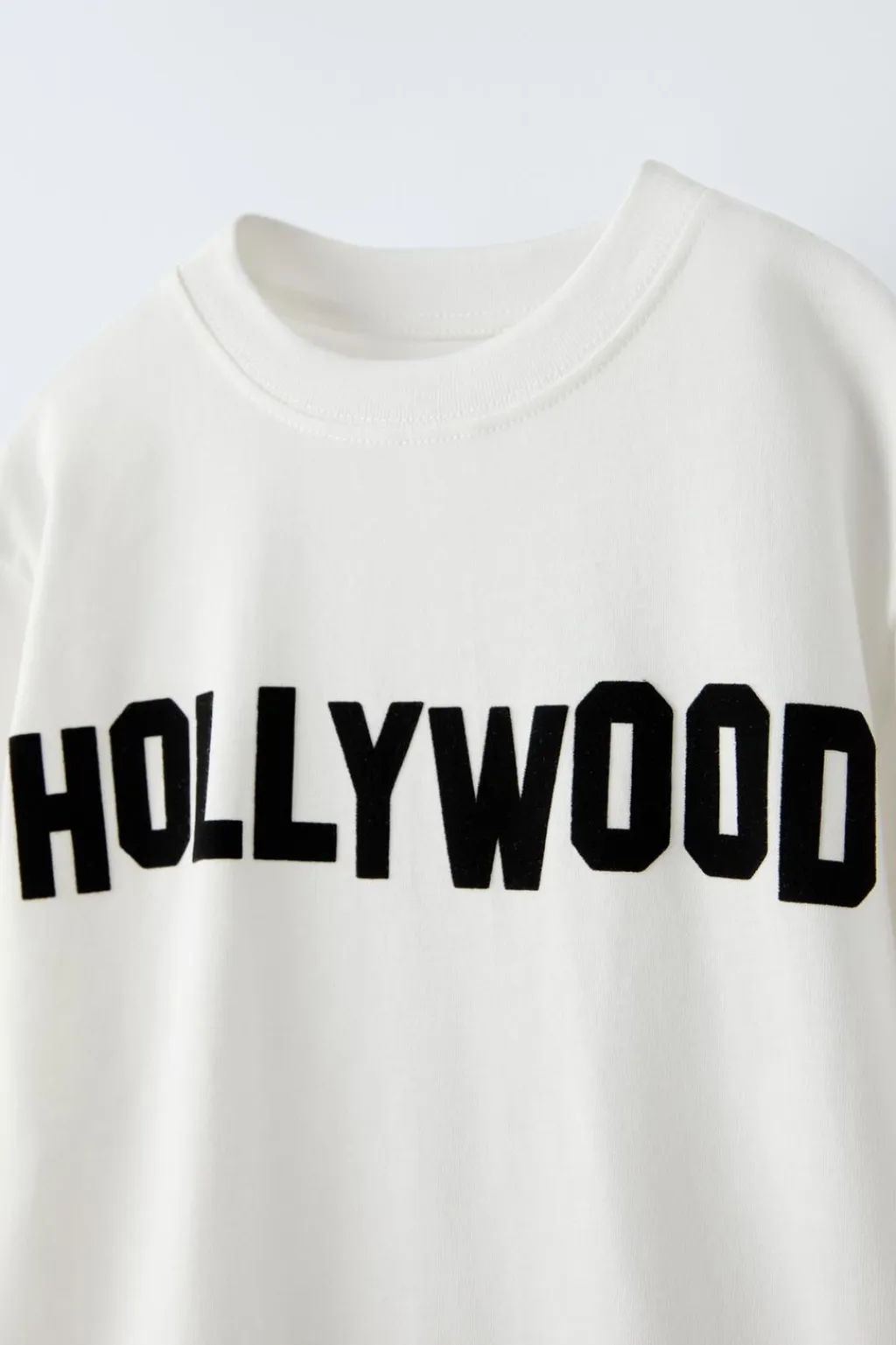 Camiseta con cuello redondo y manga corta. Estampado texto flock HOLLYWOOD ® en delantero, espalda y aplique etiqueta en bajo.