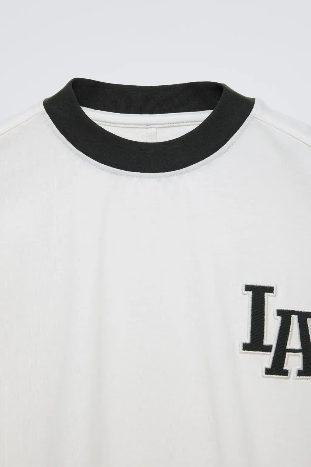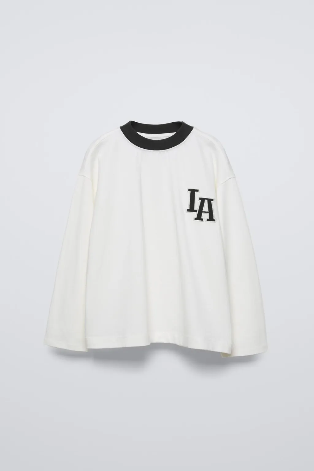 Camiseta con cuello redondo color a contraste y manga larga. Detalle bordado en pechera.