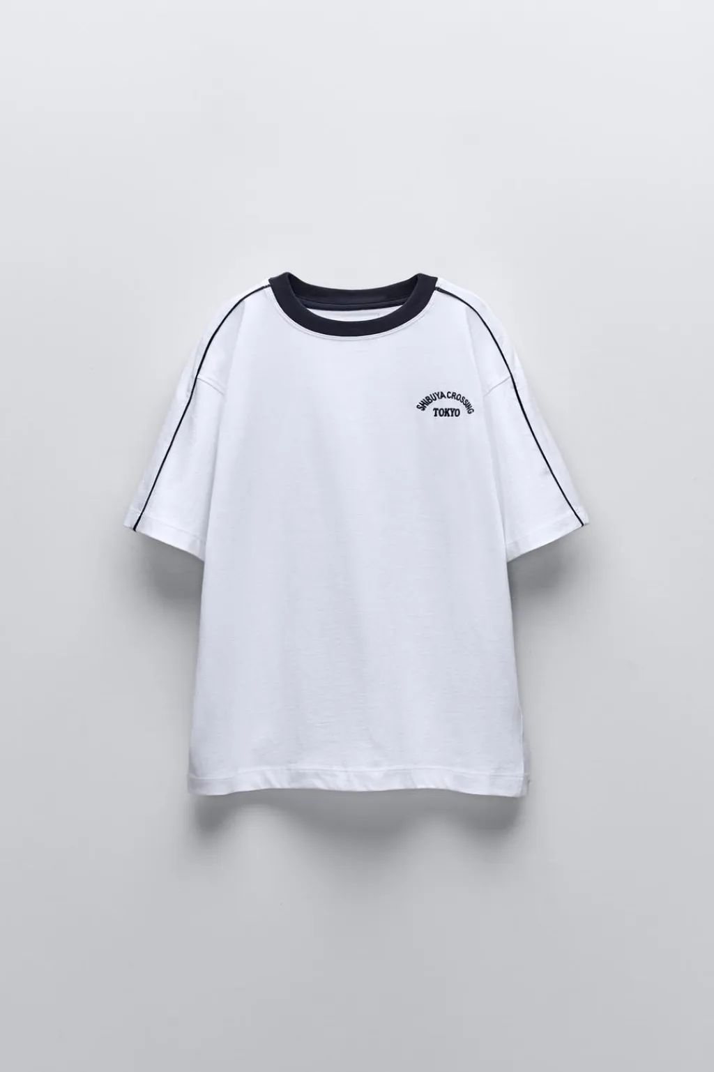 Camiseta con cuello redondo y manga corta, detalle a contraste en hombros. Bordado texto en pechera.