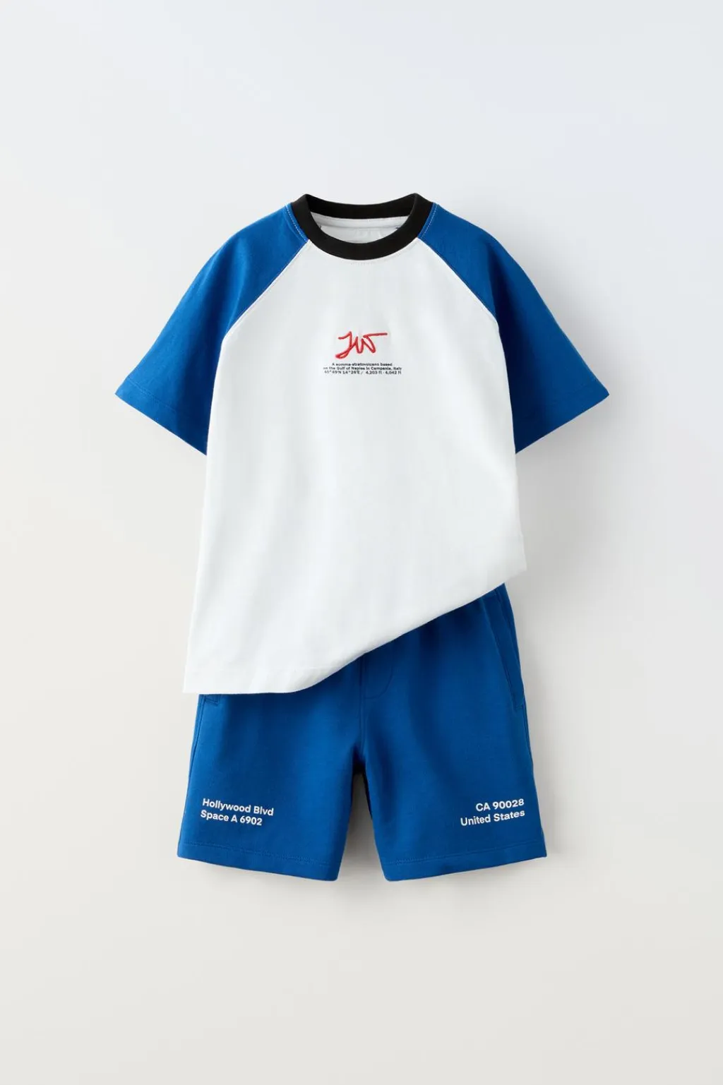 Conjunto de dos piezas. Camiseta con cuello redondo y manga ranglan corta. Detalle bordado y estampado en pechera. Bermuda con cinturilla elástica y cordones ajustables. Bolsillos en delantero y espalda. Motivo texto estampado en bajo.
