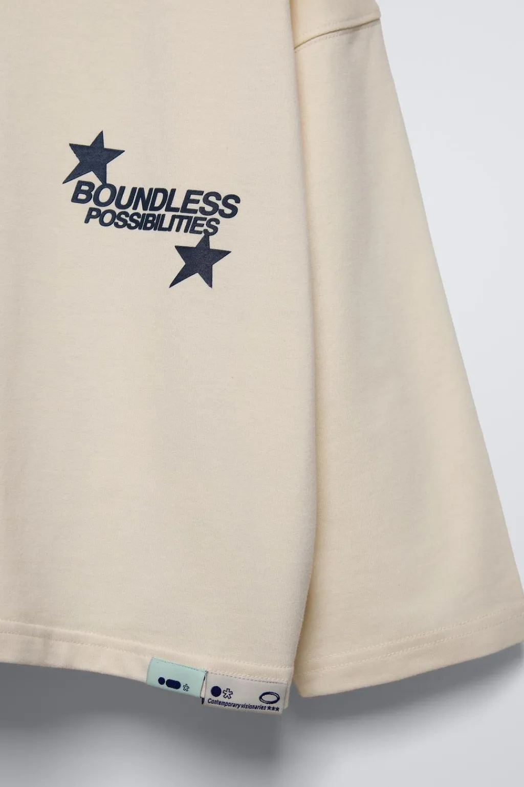 Camiseta con cuello redondo y manga larga. Detalle texto con relieve en pechera y aplique etiqueta en bajo. Estampado texto en espalda.