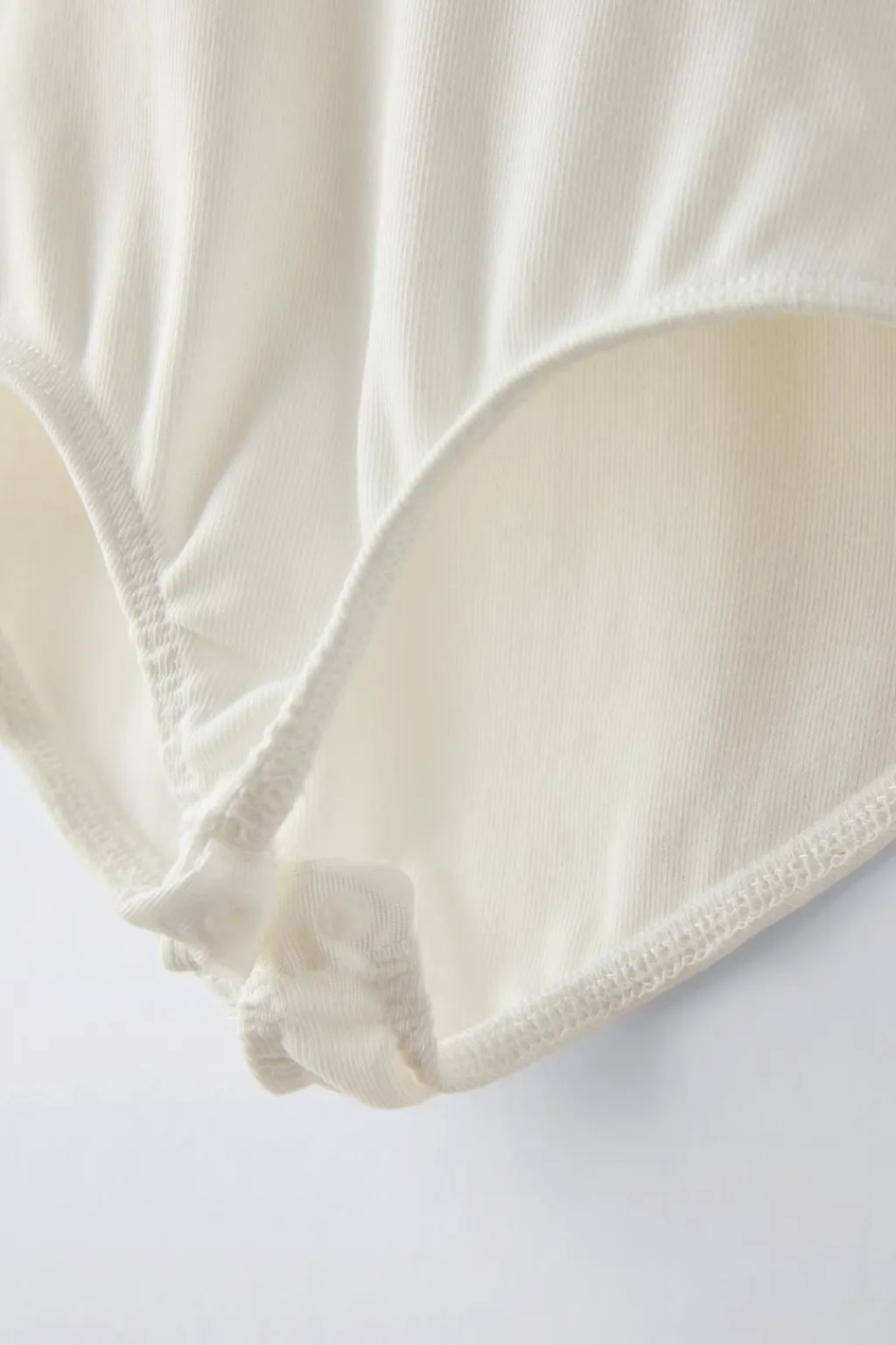 Body con cuello redondo y manga abullonada. Cierre botones presión en bajo.