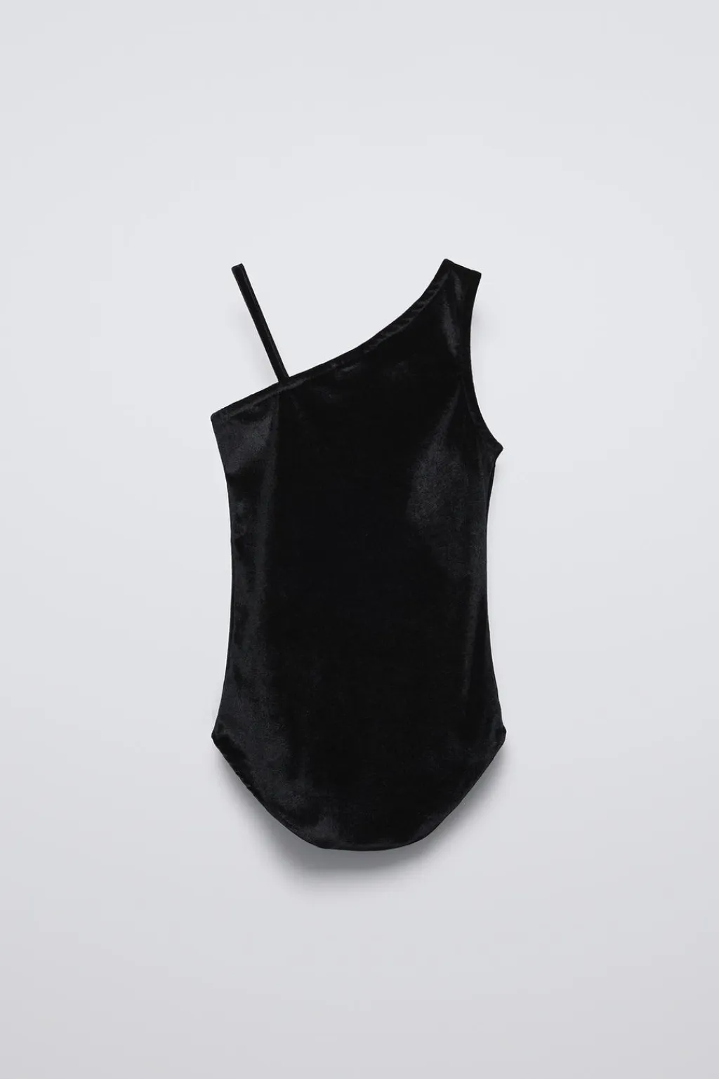 Body con cuello asimétrico y tirantes. Aplique flor en pechera. Bajo acabado en cierre botones presión. Tejido velvet suave.