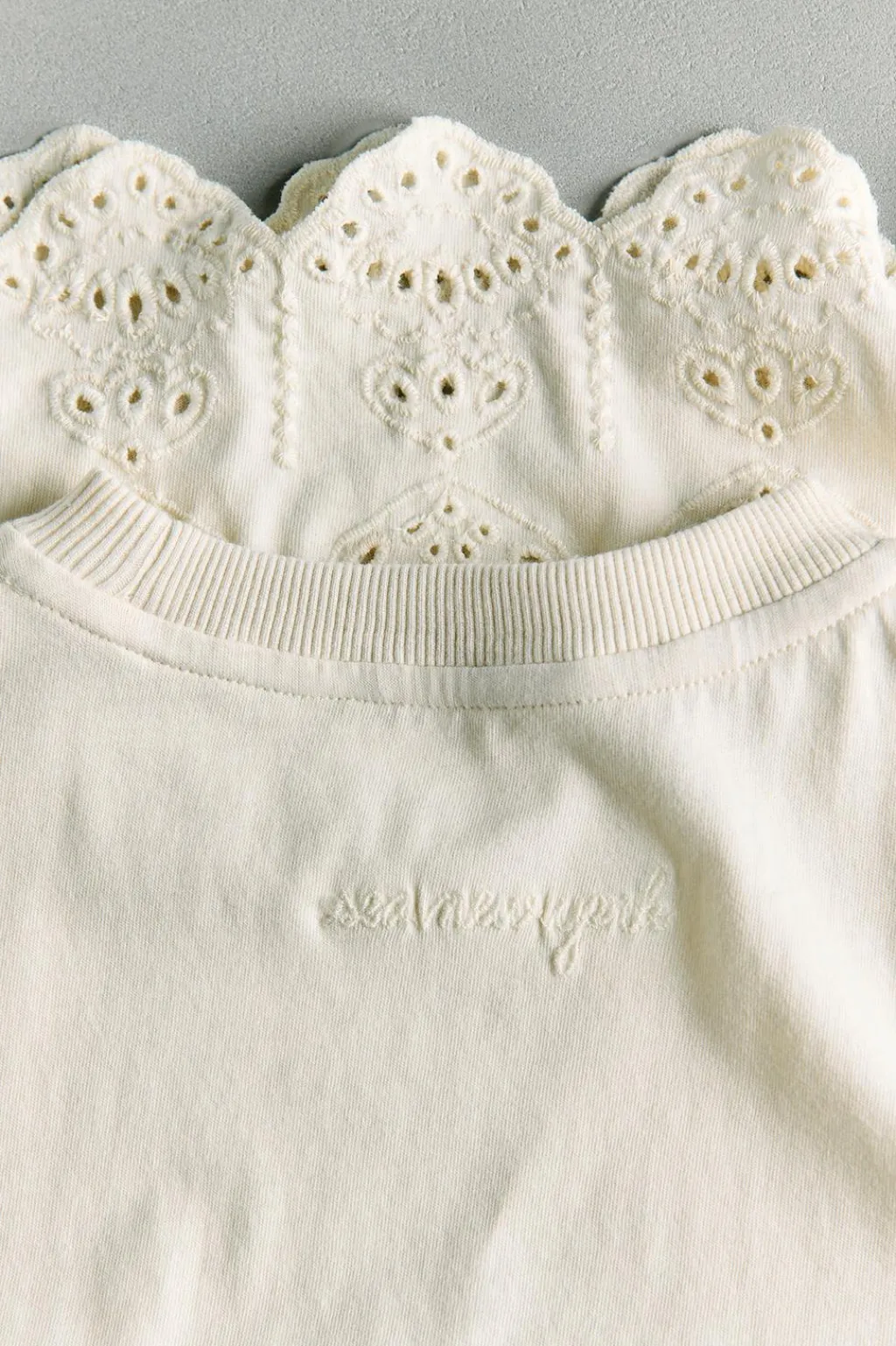 Cuello redondo con vivo en rib y manga corta. Detalle bordados y perforados acabados con ondas en mangas y bajo.