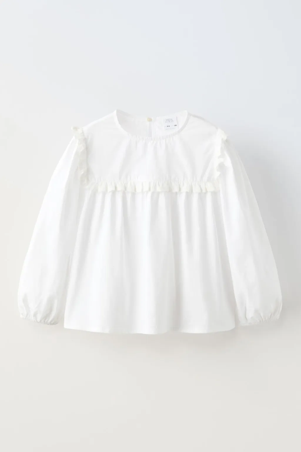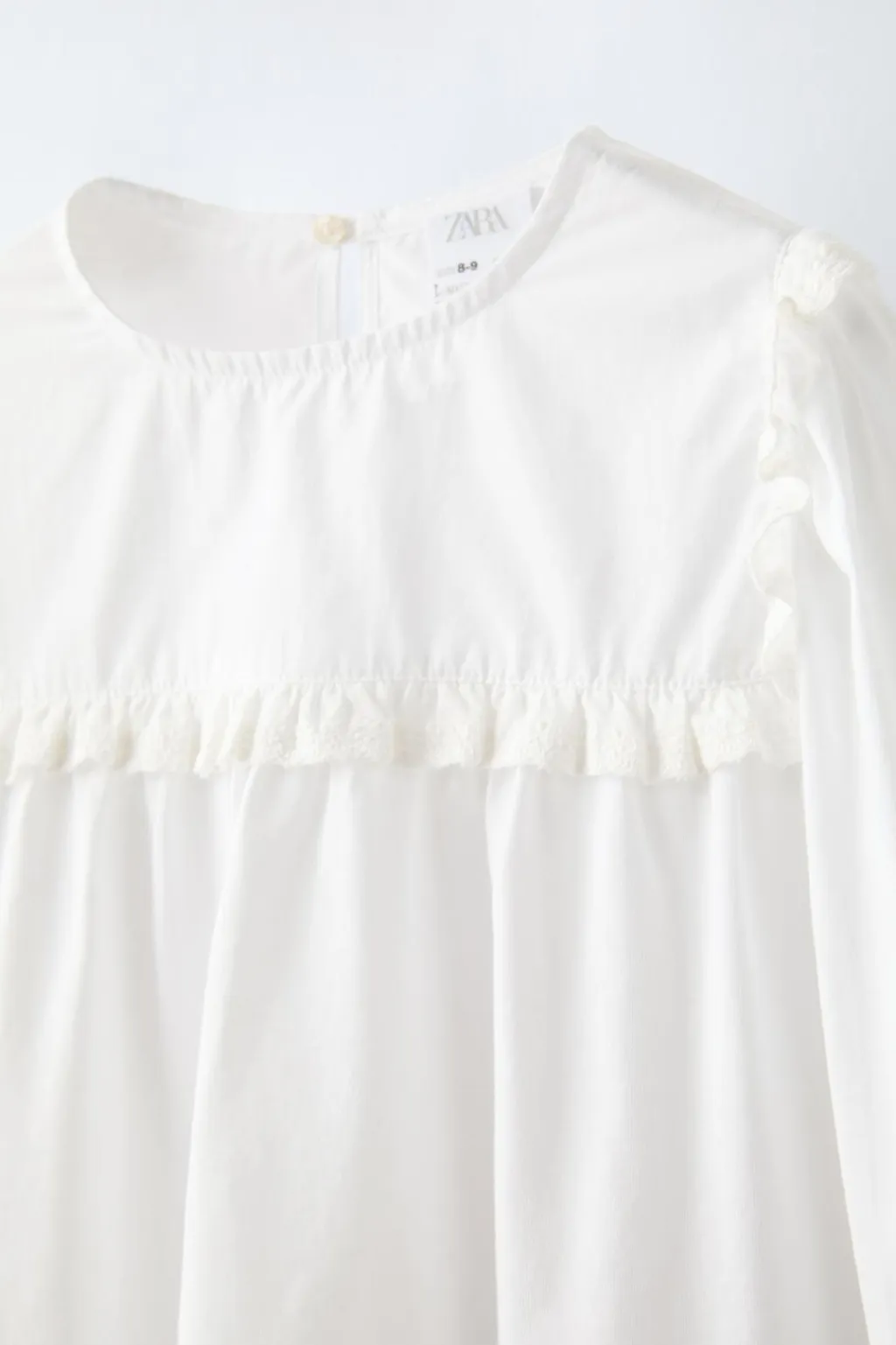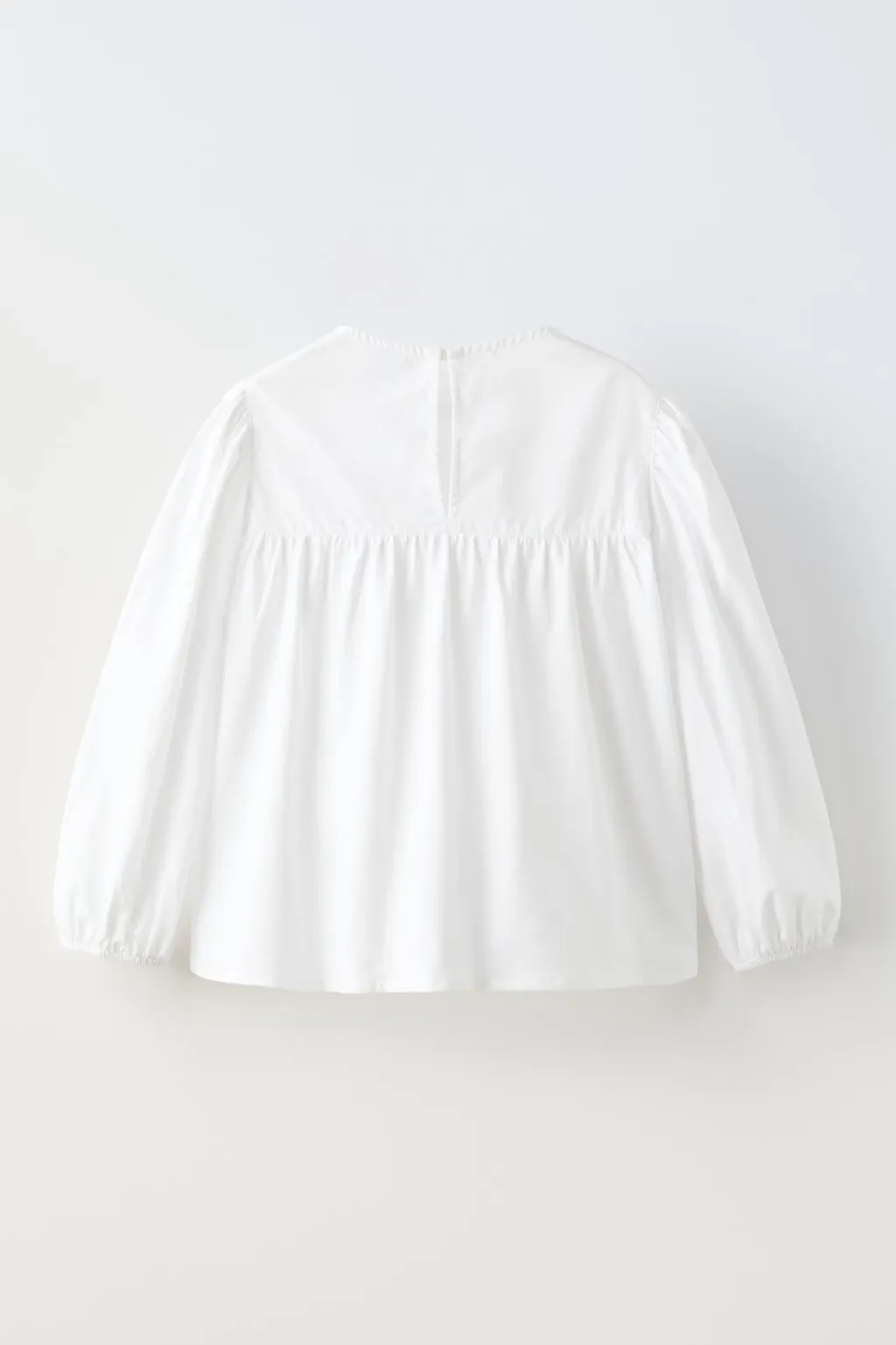 Camiseta con cuello redondo, detalle popelín en pechera y manga larga acabada en goma. Cierre tipo lágrima con botón en espalda.