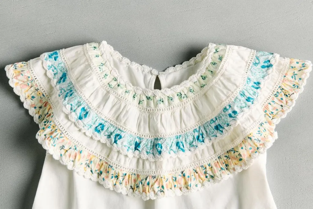 Cuello babero en tejido combinado con diferentes estampados florales y detalle acabados en crochet. Cierre tipo lágrima con botón en la espalda y SEA NEW YORK bordado a tono en bajo.